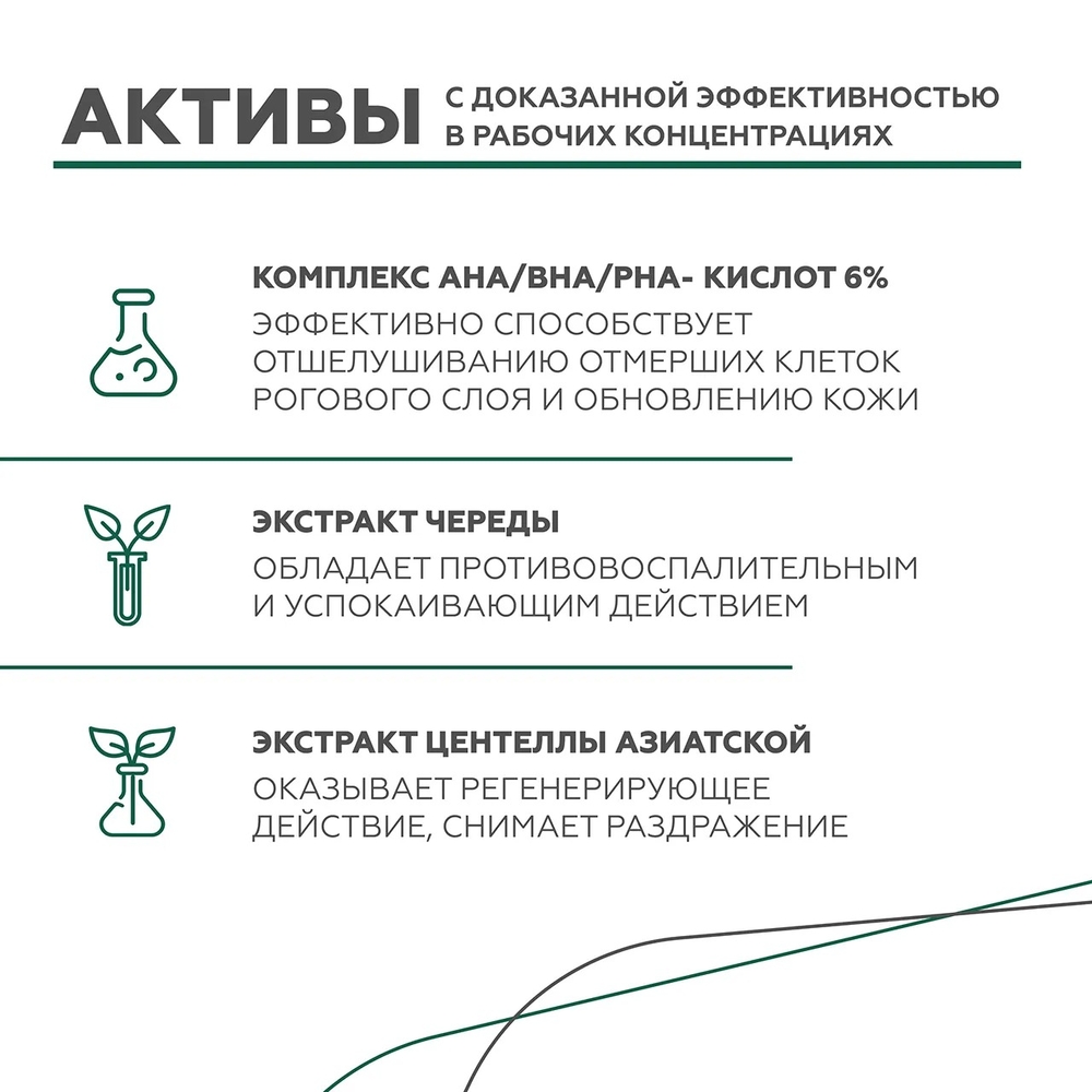 Благодаря активному комплексу из салициловой, миндальной, молочной кислот и экстрактов растений гель глубоко и эффективно очищает, не пересушивая кожу, выравнивает микрорельеф кожи, обладает себорегулирующим и противовоспалительным действием, способствует уменьшению количества высыпаний, а также отшелушиванию омертвевших клеток рогового слоя и обновлению кожи, борется с постакне.
