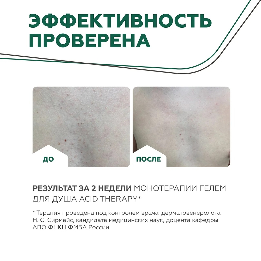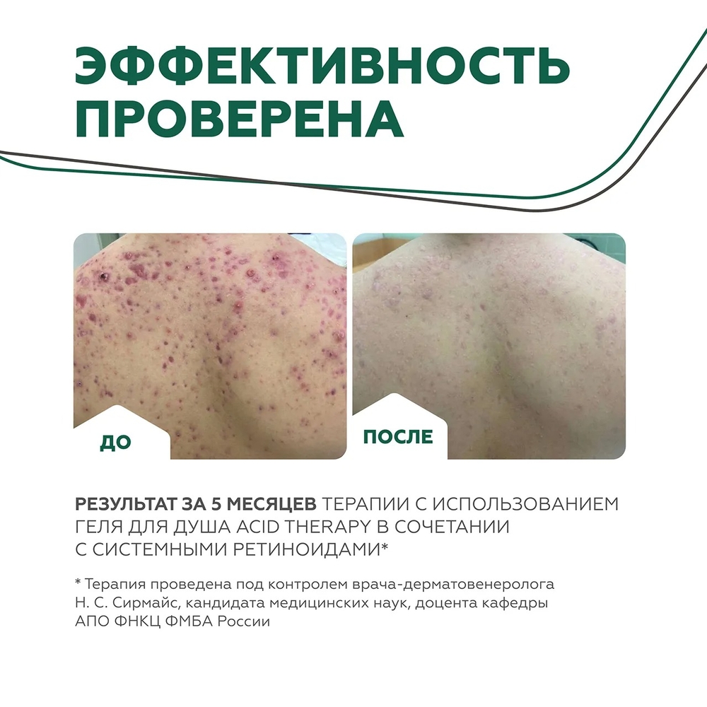 Кислотный гель для душа, предназначен для ежедневного и эпизодического использования в качестве очищающего средства для кожи тела. Подходит для комбинированной, проблемной кожи и кожи с гиперкератозом, для тех, кого беспокоят высыпания на спине и груди, а также вросшие волосы в местах их удаления.