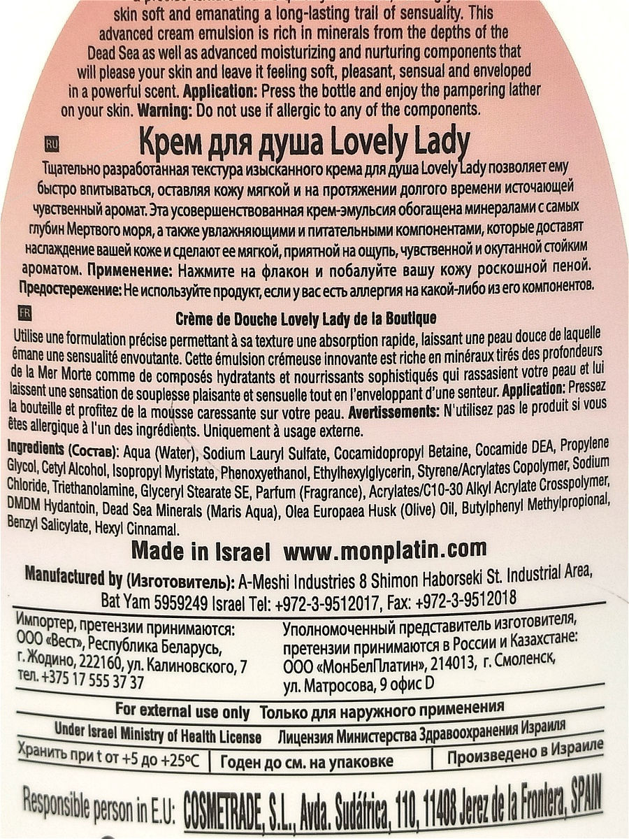 | Изготовитель | A-Meshi Cosmetics Industries, Израиль, 8 Shimon Haborseki St. Industrial Area, Bat Yam, 59598 |