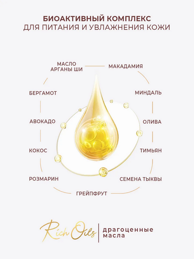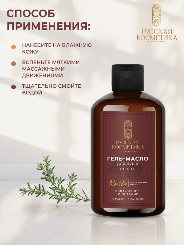 Всего одно средство вместо тысячи, чтобы сделать вашу кожу великолепной! Гель-масло – это современное средство для душа, которое нежно и бережно очищает и максимально увлажняет даже самую чувствительную кожу, не нарушая ее естественный гидролипидный баланс. При контакте с водой гель-масло превращается в бархатистую пену, окутывающую Вас тончайшим шлейфом благородного аромата и дарит ощущение нежности и комфорта во время ухода.