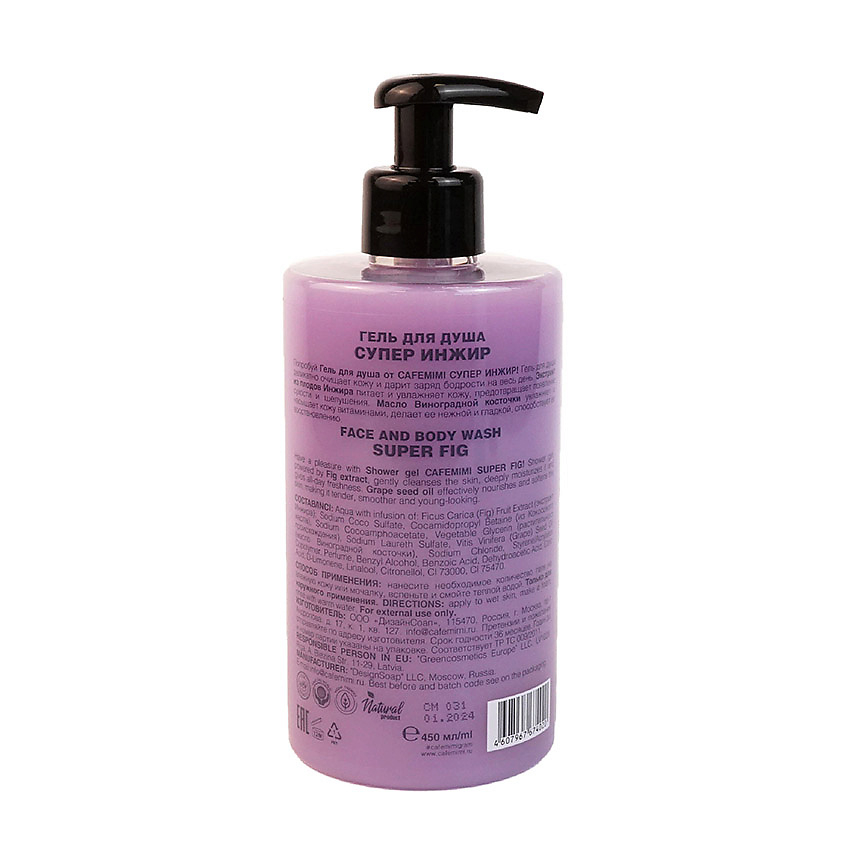 Aqua with infusion of Ficus Carica (Fig) Fruit Extract (экстракт Инжира); Sodium Coco Sulfate, Cocamidopropyl Betaine (из Кокосового масла), Sodium Cocoamphoacetate, Vegetable Glycerin (растительного происхождения), Sodium Laureth Sulfate, Vitis Vinifera (Grape) Seed Oil (масло Виноградной косточки), Sodium Chloride, Styrene/Acrylates Copolymer, Perfume, Benzyl Alcohol, Benzoic Acid, Dehydroacetic Acid, Citric Acid, D-Limonene, Linalool, Citronellol, Cl 73000, CI 75470.