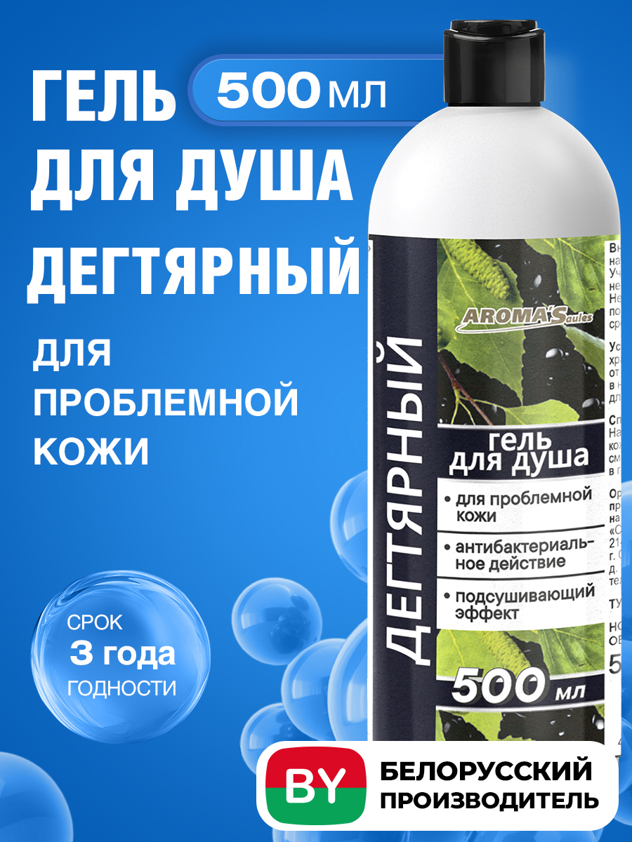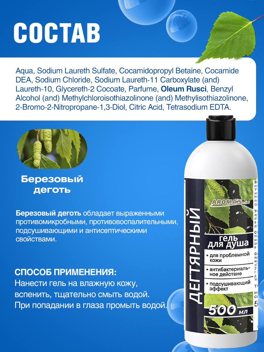 Гель для душа "Дегтярный" на основе натурального берёзового дёгтя подходит для проблемной кожи, оказывает подсушивающий эффект, обладает бактерицидным действием.