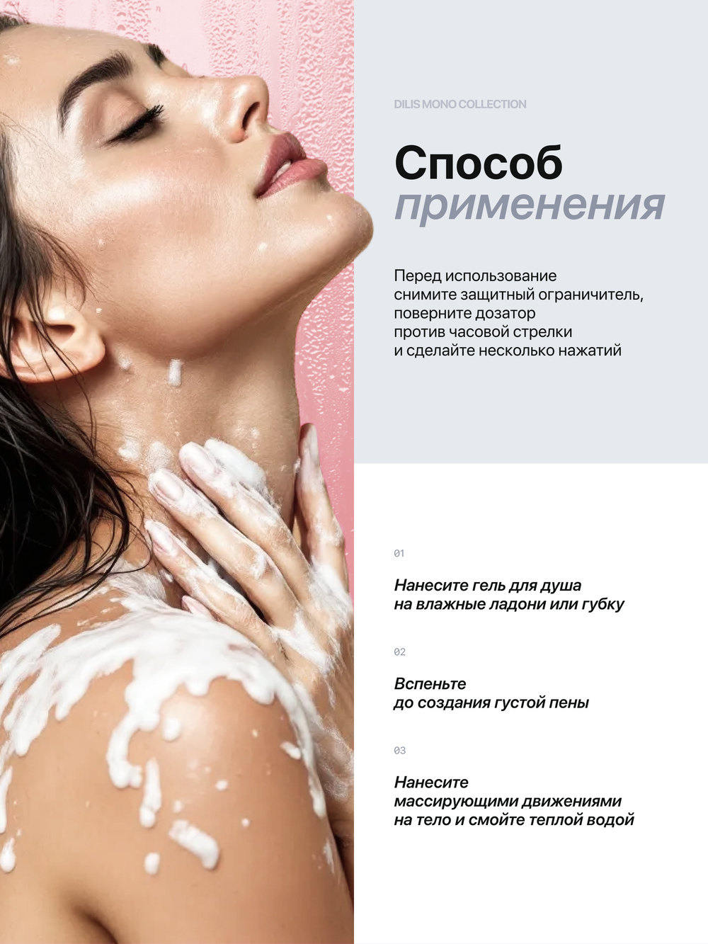 Парфюмированные гели для душа Dilis Mono Collection деликатно очищают и увлажняют кожу, помогая ей оставаться здоровой и увлажненной.