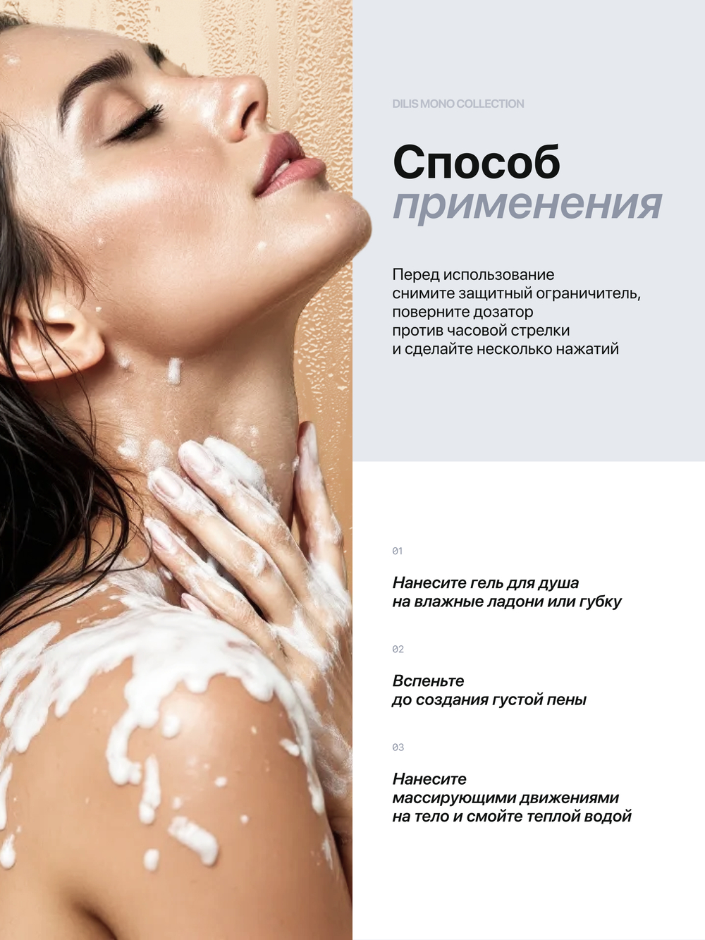 Парфюмированные гели для душа Dilis Mono Collection деликатно очищают и увлажняют кожу, помогая ей оставаться здоровой и увлажненной.