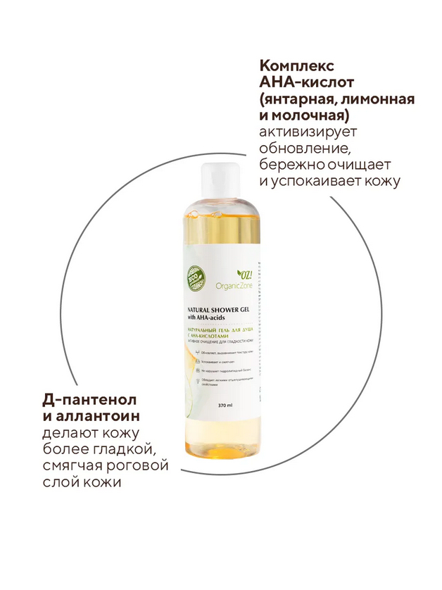 Натуральный гель для душа c AHA-кислотами обладает легкими отшелушивающими свойствами, выравнивает текстуру кожи, делая ее мягче.