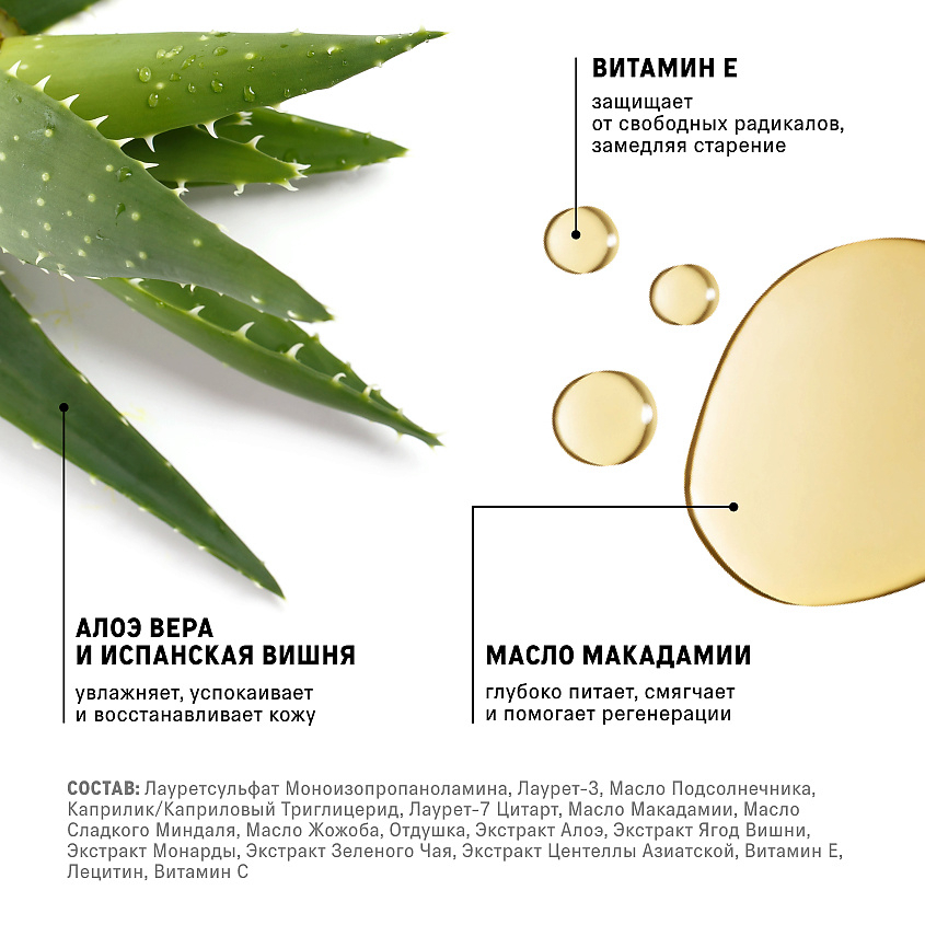 Mipa-laureth sulfate, laureth-3, helianthus annuus (sunflower) seed oil, caprylic/capric triglyceride, laureth-7 citrate, macadamia integrifolia (macadamia) seed oil, prunus amygdalus dulcis (sweet almond) oil, simmondsia chinensis (jojoba) seed oil, fragrance, aloe barbadensis (aloe vera) leaf extract, prunus cerasus (bitter cherry) fruit extract, monarda didyma (bergamot) extract, camellia sinensis (green tea) extract, centella asiatica (gotu kola) extract, tocopheryl acetate, lecithin, tocopherol, ascorbyl palmitate.