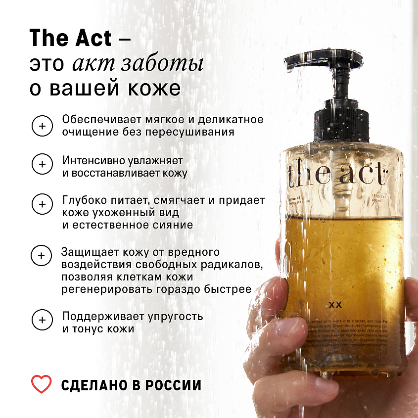 Масло для душа – новое средство линейки "XX" от бренда косметики "The Act", разработанной для расслабления, восстановления тела, разума и эмоционального состояния.