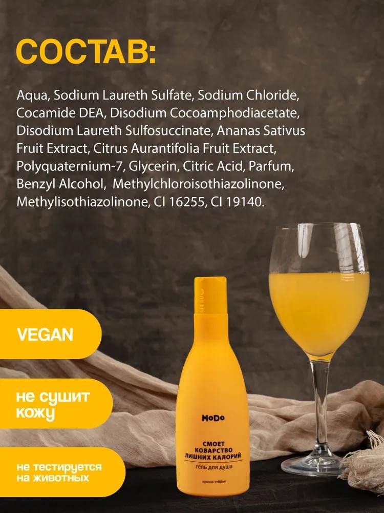 Гель для душа MODO "Смоет коварство лишних калорий" – это идеальное решение для тех, кто ценит не только чистоту, но и приятные ароматы. Этот парфюмированный гель для душа, объемом 250 мл, подарит вам ощущение свежести и комфорта после каждого применения. Его сочный, тропический аромат с нотками ананаса и лайма перенесет вас в мир экзотических фруктов и солнечного тепла. Гель для душа MODO подходит для всех типов кожи, в том числе для комбинированной и сухой, обеспечивая эффективное очищение, питание и увлажнение.