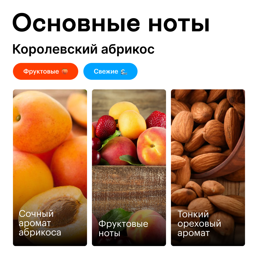Чем отличается "Королевский" абрикос от своих братьев? Французским происхождением. Как известно, французы знают толк и во вкусах, и в ароматах. Сорт Королевского абрикоса отличается от других ярко-красным румянцем плодов и насыщенным фруктово-ореховым запахом, который отлично передан в аромате.