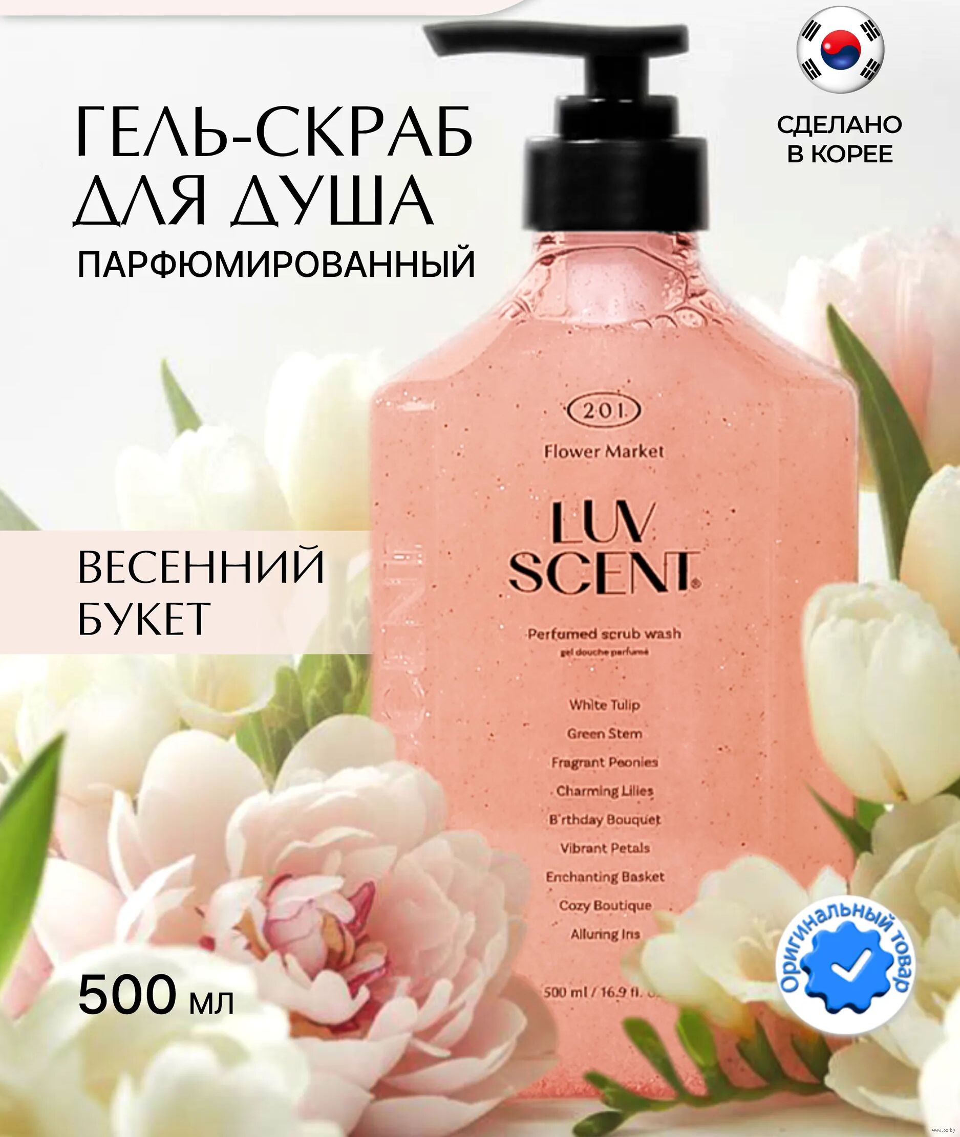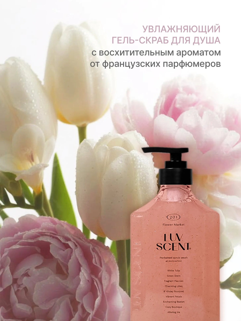 Увлажняющий гель-скраб с натуральными маслами и ароматом от французского парфюмера. Окунитесь в яркий свежий аромат цветочного магазина – корзины с цветами, букеты, охапки весенних тюльпанов, роскошные пионы, льдистый аромат фрезий, ирисы и лилии, свежая зелень и лучи весеннего солнца.
