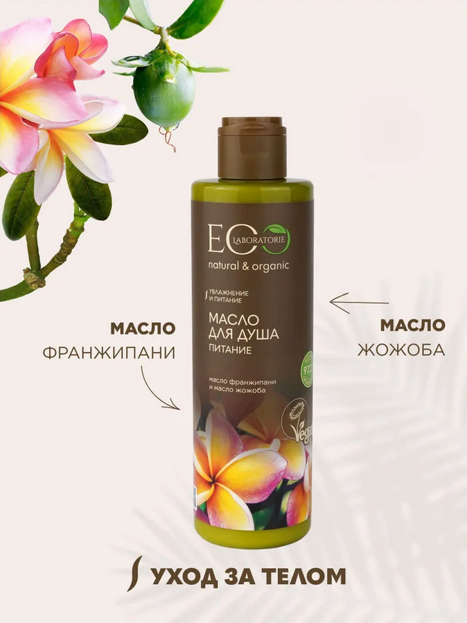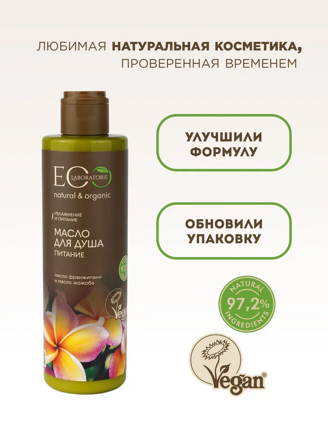 Масло омолаживает, тонизирует кожу, повышает ее упругость и эластичность. Масло содержит более 95% ингредиентов растительного происхождения. Высокое содержание масел – более 10%, благодаря чему не требуется использование молочка или крема после душа. Активные ингредиенты: масло франжипани и масло жожоба.