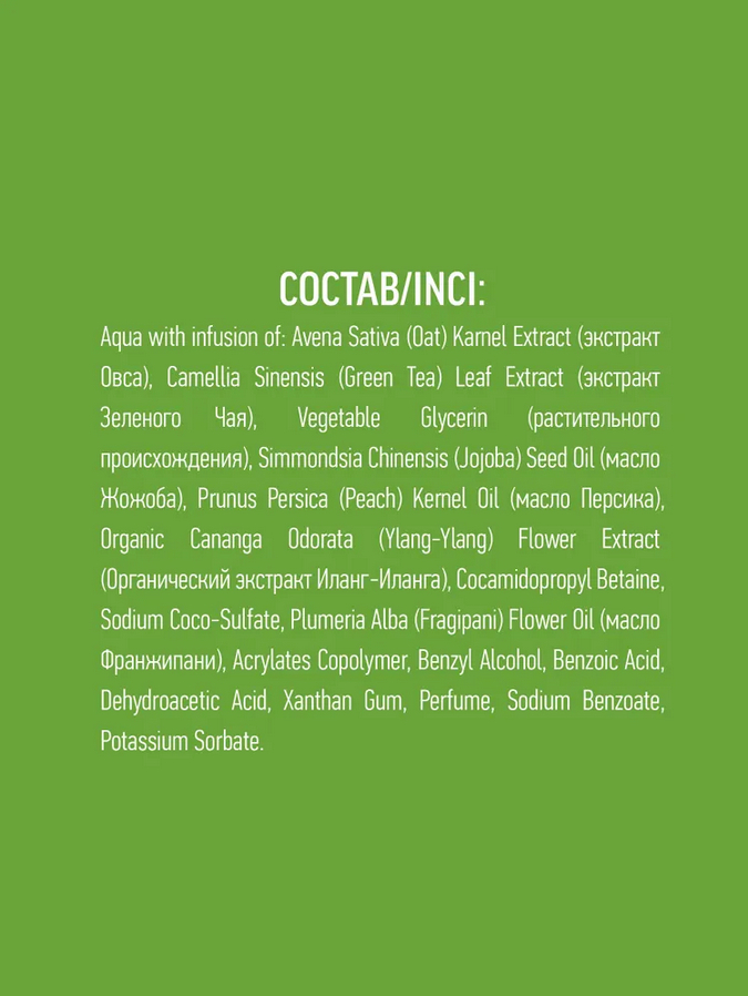 Avena Sativa water (отвар Овсяных хлопьев), Green Tea floral water (настой Зеленого Чая), Simmondsia Chinensis Oil (масло Жожоба), Organic Prunus Persica Kernel Oil (масло Персика), Organic Ylang-Ylang extract (Органический экстракт Иланг-Иланга), Cocamidopropyl Betaine (из кокосового масла), Sodium coco-sulfate (из кокосового масла), Plumeria Alba Flower extract (масло Франжипани), Glycerin, Xanthan Gum, Perfume, Sodium Benzoate, Potassium Sorbate, Sorbic Acid, CI75810.