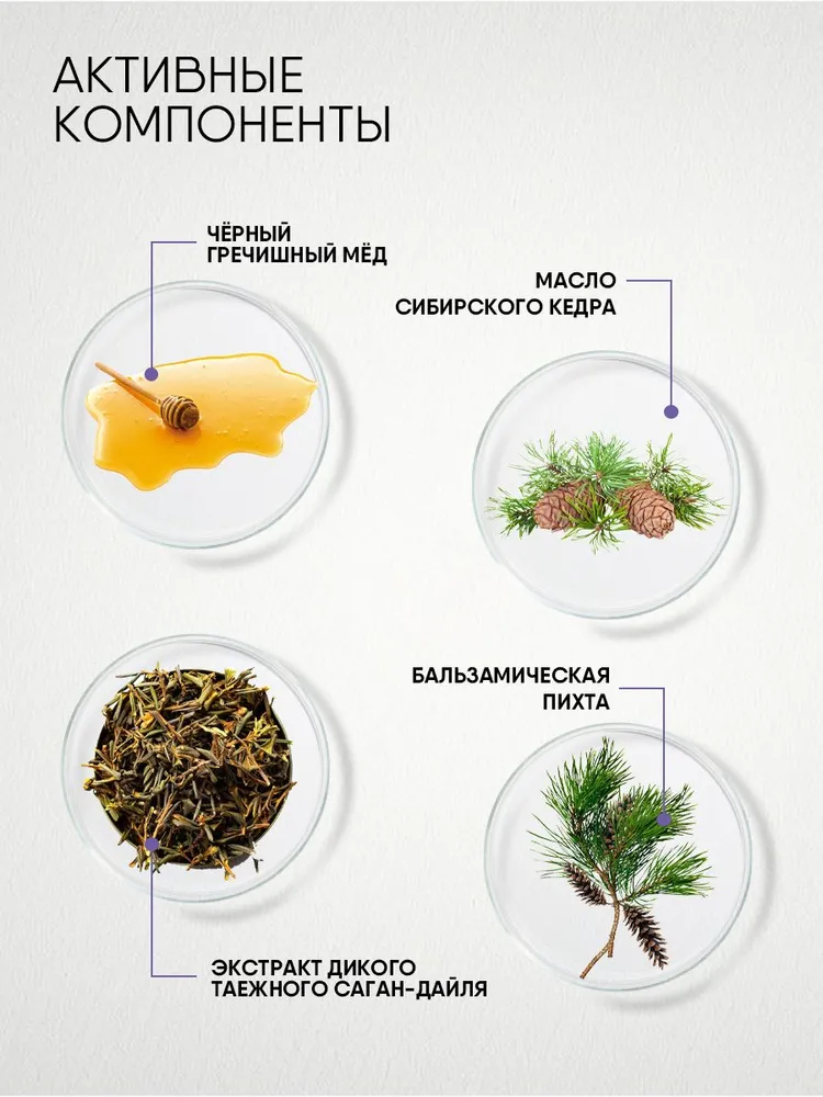 Черный гречишный мед мгновенно питает и наполняет жизненной энергией. Органическое масло сибирского кедра – природный источник Омега 3-6-9 и витамина Е, подтягивает и улучшает тонус кожи. Бальзамическая пихта – источник фитонцидов, успокаивает чувствительную кожу.