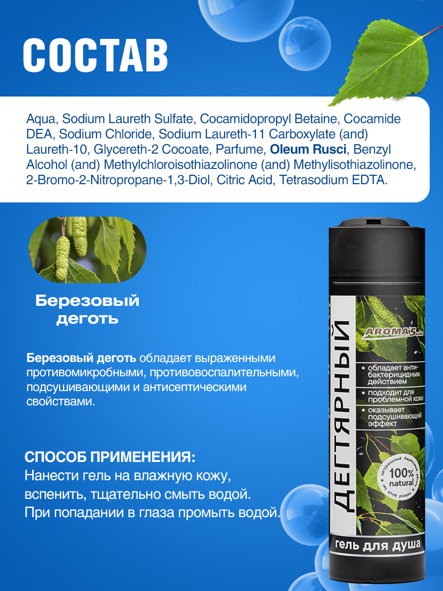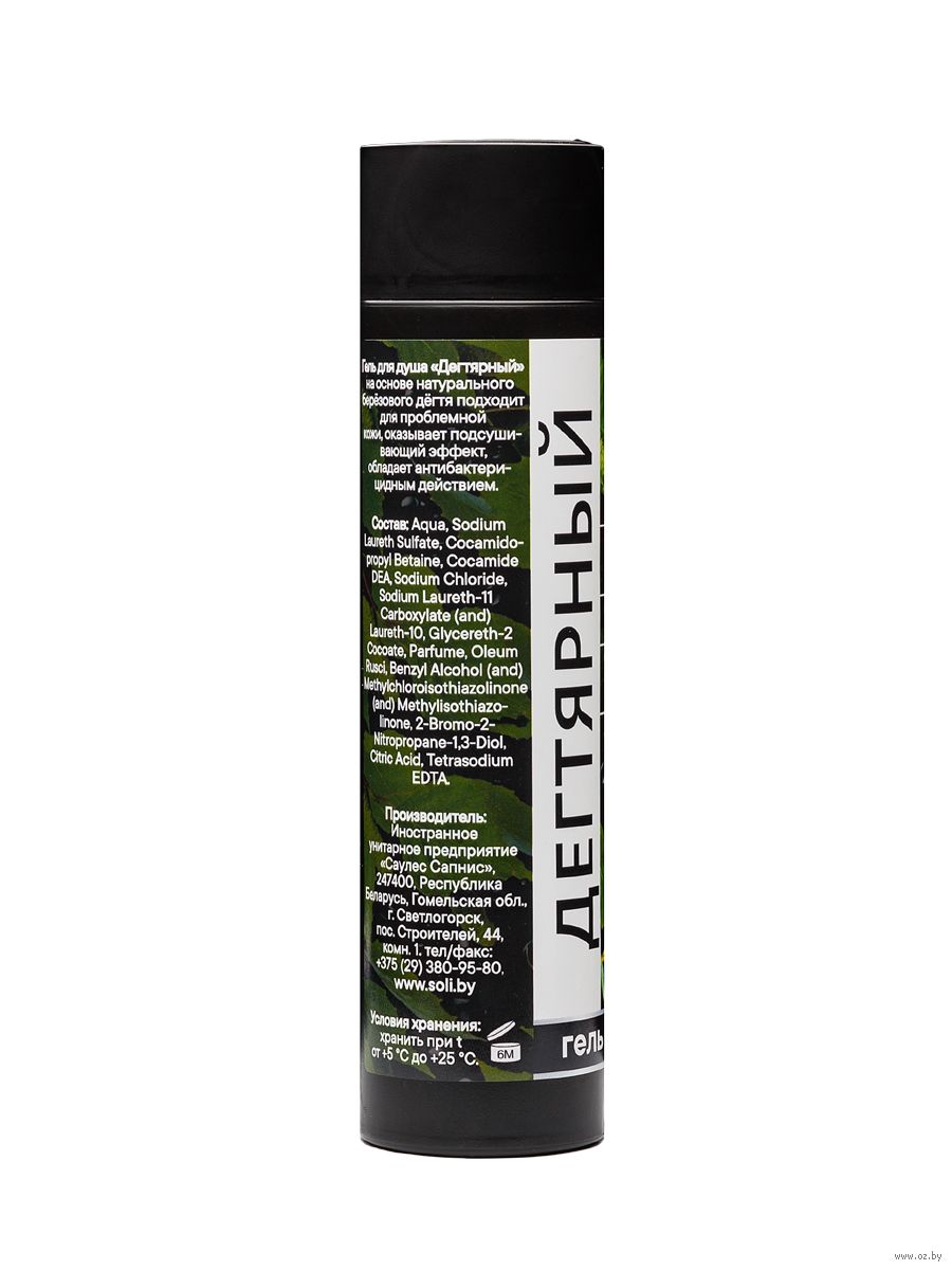 Гель для душа «Дегтярный» на основе натурального берёзового дёгтя подходит для проблемной кожи, оказывает подсушивающий эффект,обладает антибактерицидным действием.