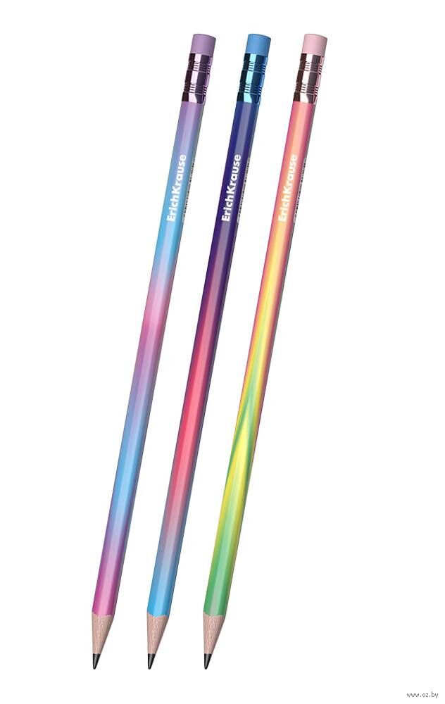 Эргономичный трехгранный чернографитный карандаш из отборной древесины с ластиком, твердость НВ. Три дизайна корпуса карандаша, цветные ластики.