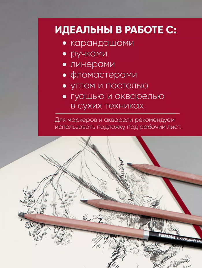 Внутренний блок состоит из 80 листов высококачественной бумаги цвета слоновой кости плотностью 140 г/м2. Походит для рисования разными материалами: карандашами, линерами, пастелью, графитом, ручками и другими. Тип скрепления – сшивка.
