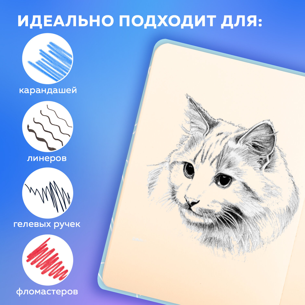 Подходит для работы с широким спектром графических материалов (ручки, карандаши, линеры и прочие). Благодаря компактному формату его можно носить с собой, а жесткая обложка станет верным подспорьем для рисования на весу.