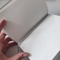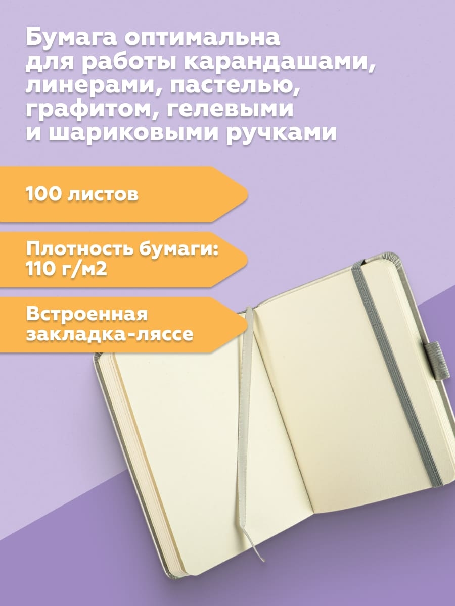 Лаконичный, компактный размер и жёсткая обложка с эффектом soft-touch обеспечивает удобство зарисовок на прогулке или в путешествии. Цвет обложки – серебро. Закладка-ляссе помогает быстро открыть скетчбук на нужной странице, а эластичная резинка предотвращает листы от замятия и случайного открытия.
