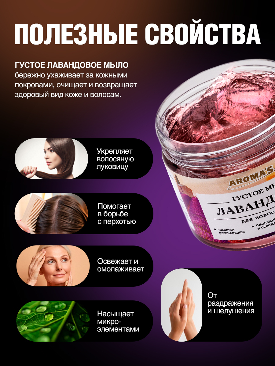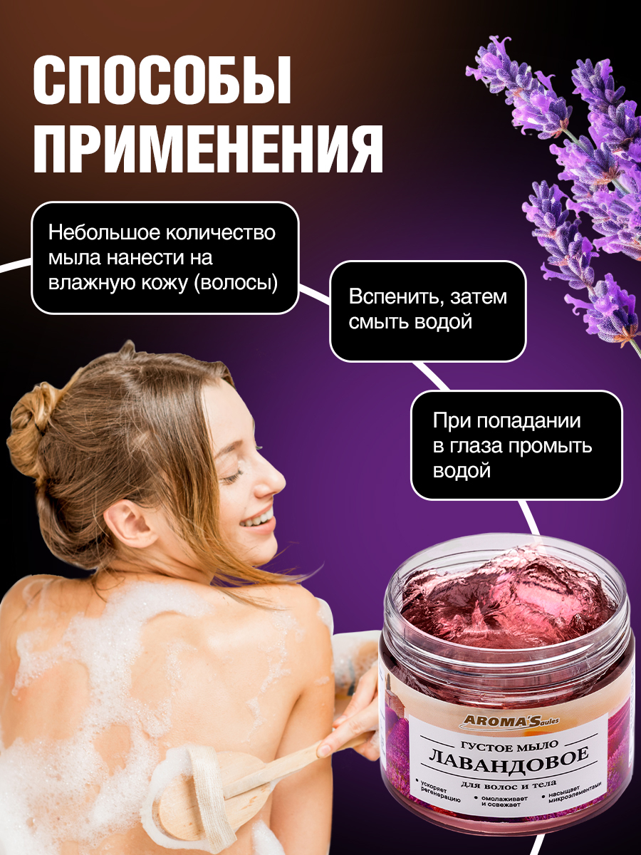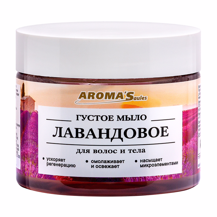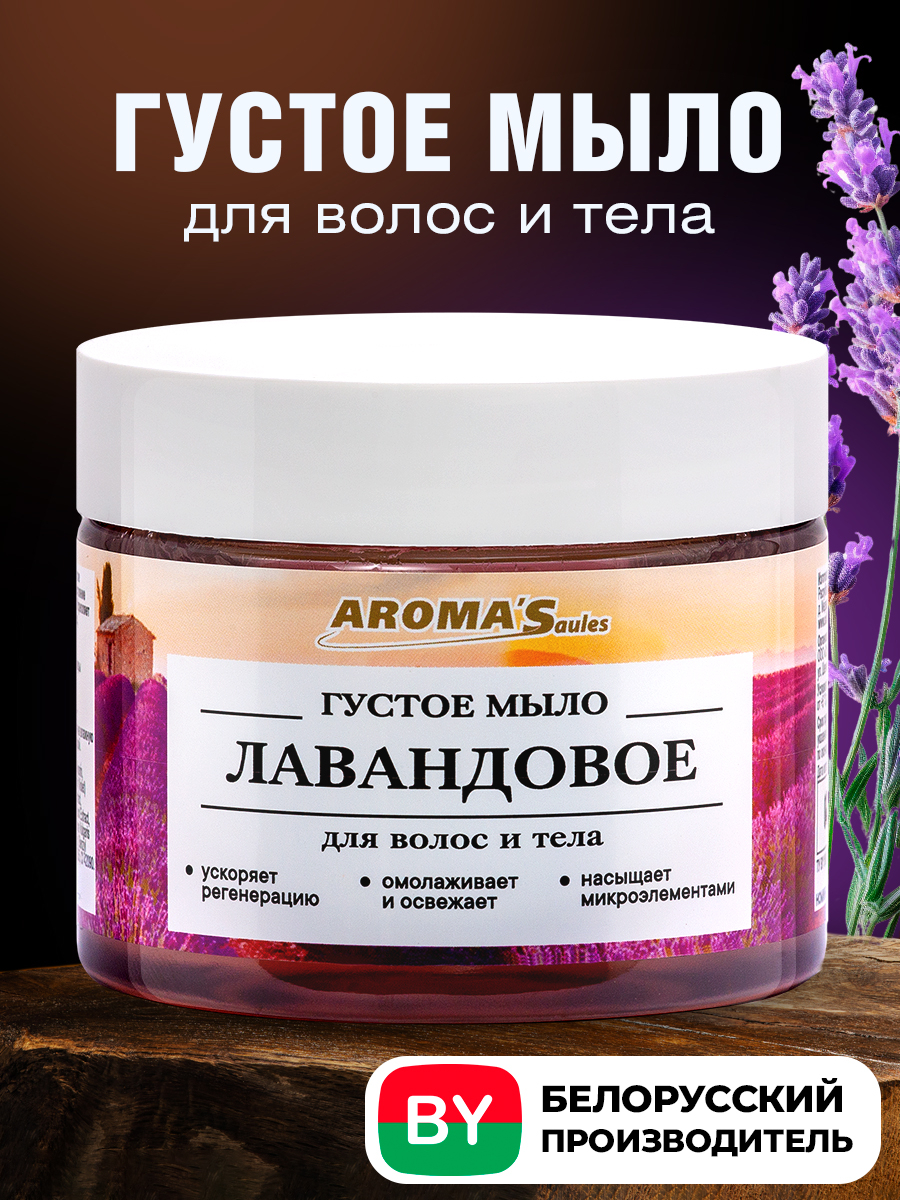 Благодаря богатому составу природных компонентов густое Лавандовое мыло бережно ухаживает за кожными покровами, очищает и возвращает здоровый вид коже и волосам.