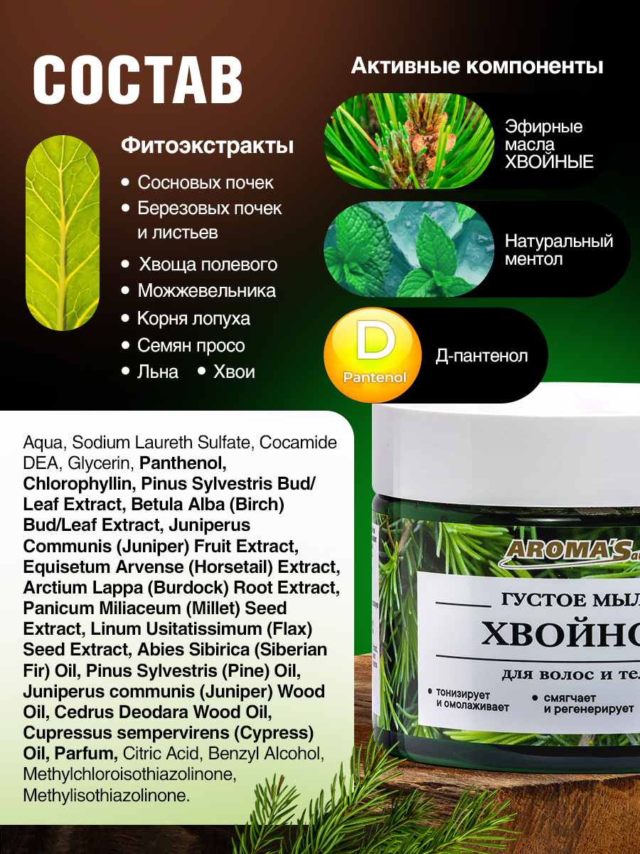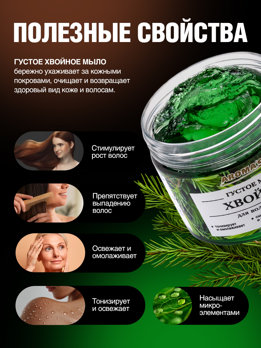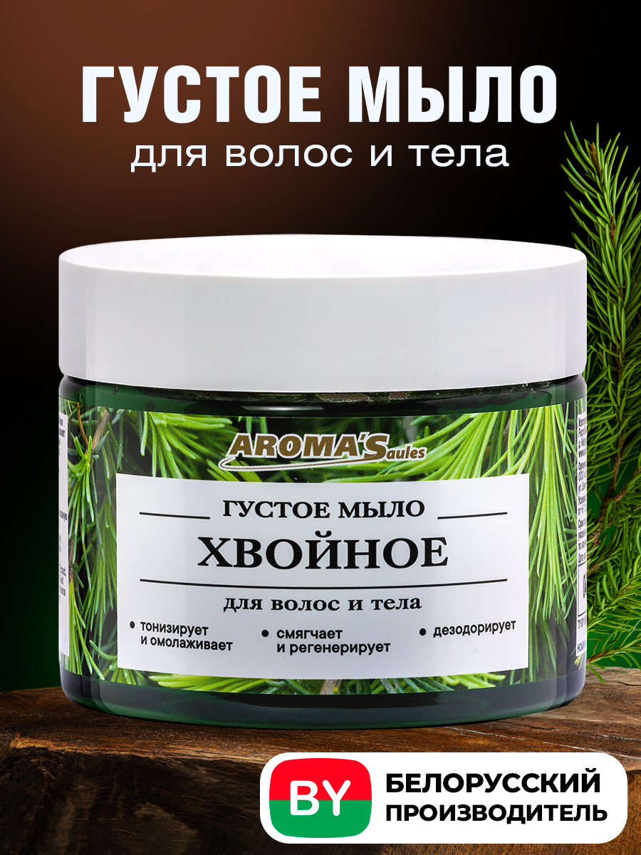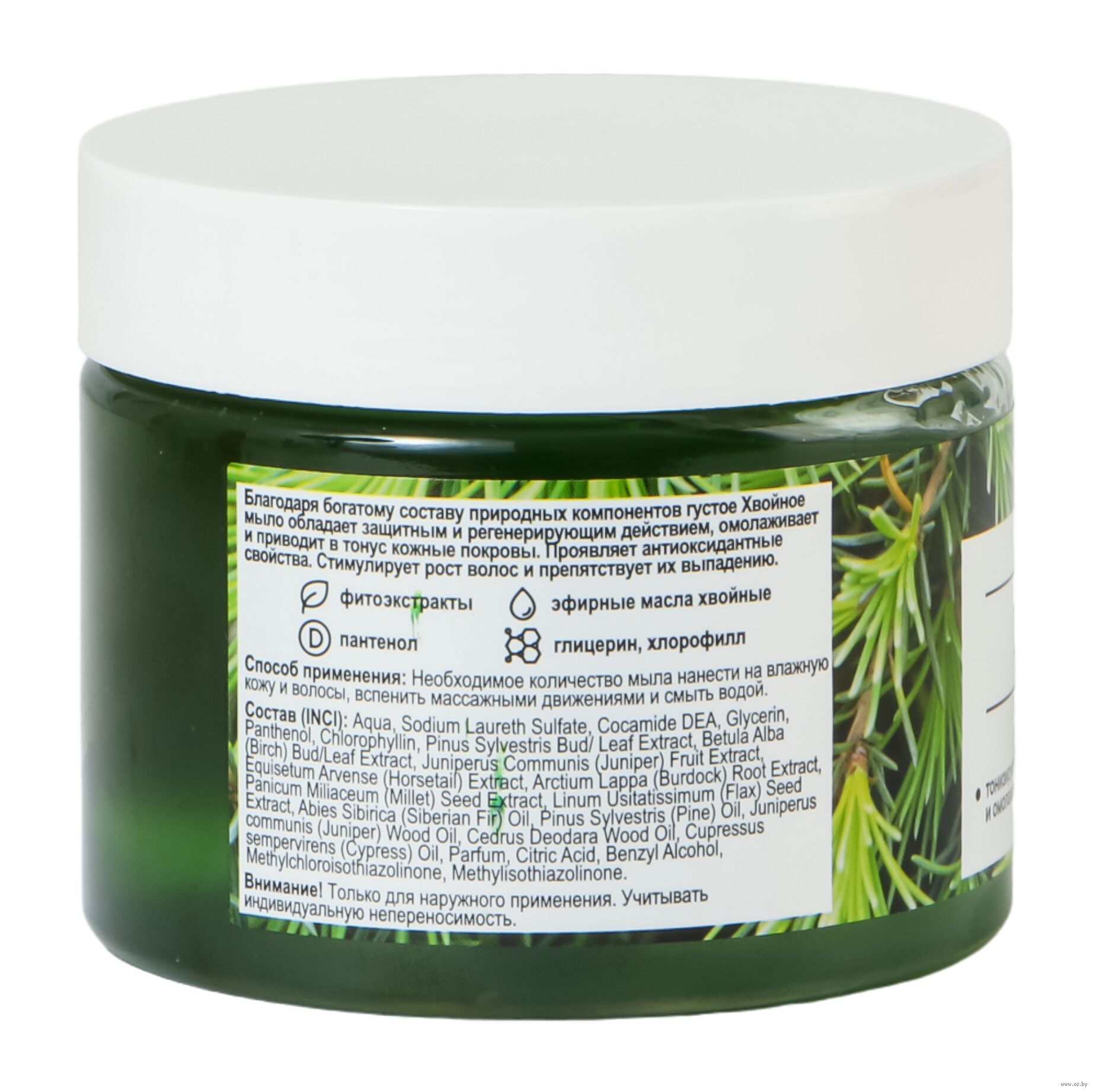 Благодаря богатому составу природных компонентов густое Хвойное мыло бережно ухаживает за кожными покровами, очищает и возвращает здоровый вид коже и волосам.