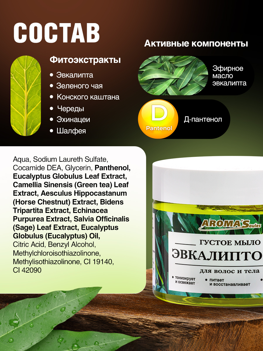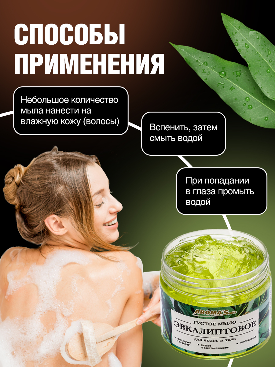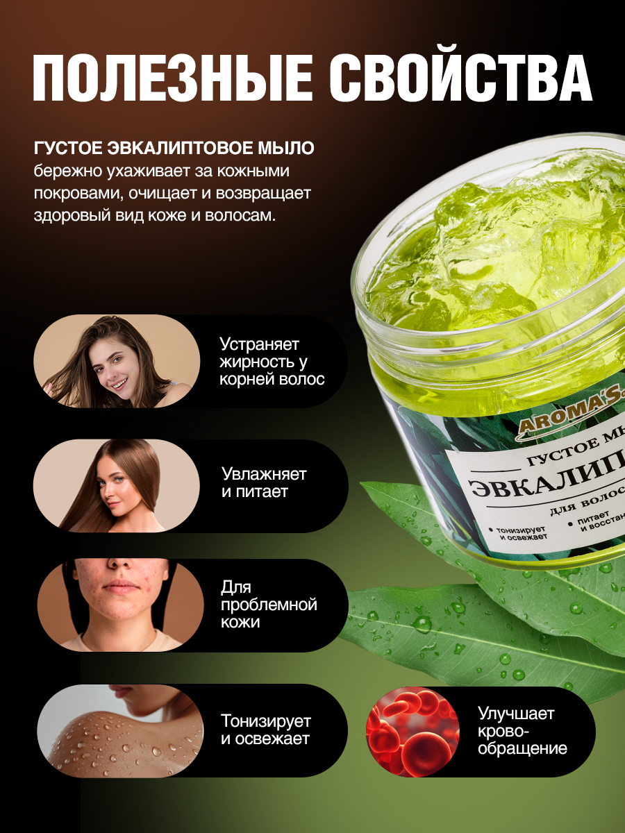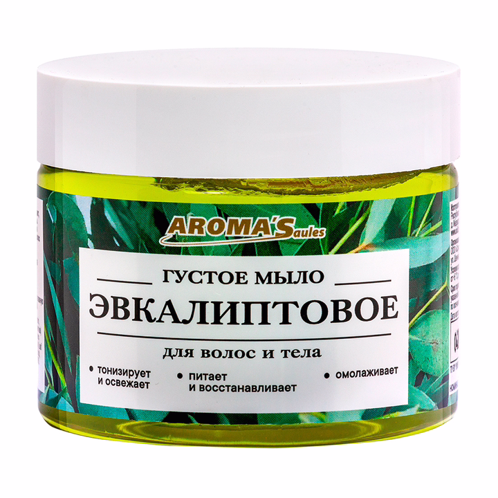 Благодаря богатому составу природных компонентов густое Эвкалиптовое мыло бережно ухаживает за кожными покровами, очищает и возвращает здоровый вид коже и волосам.
