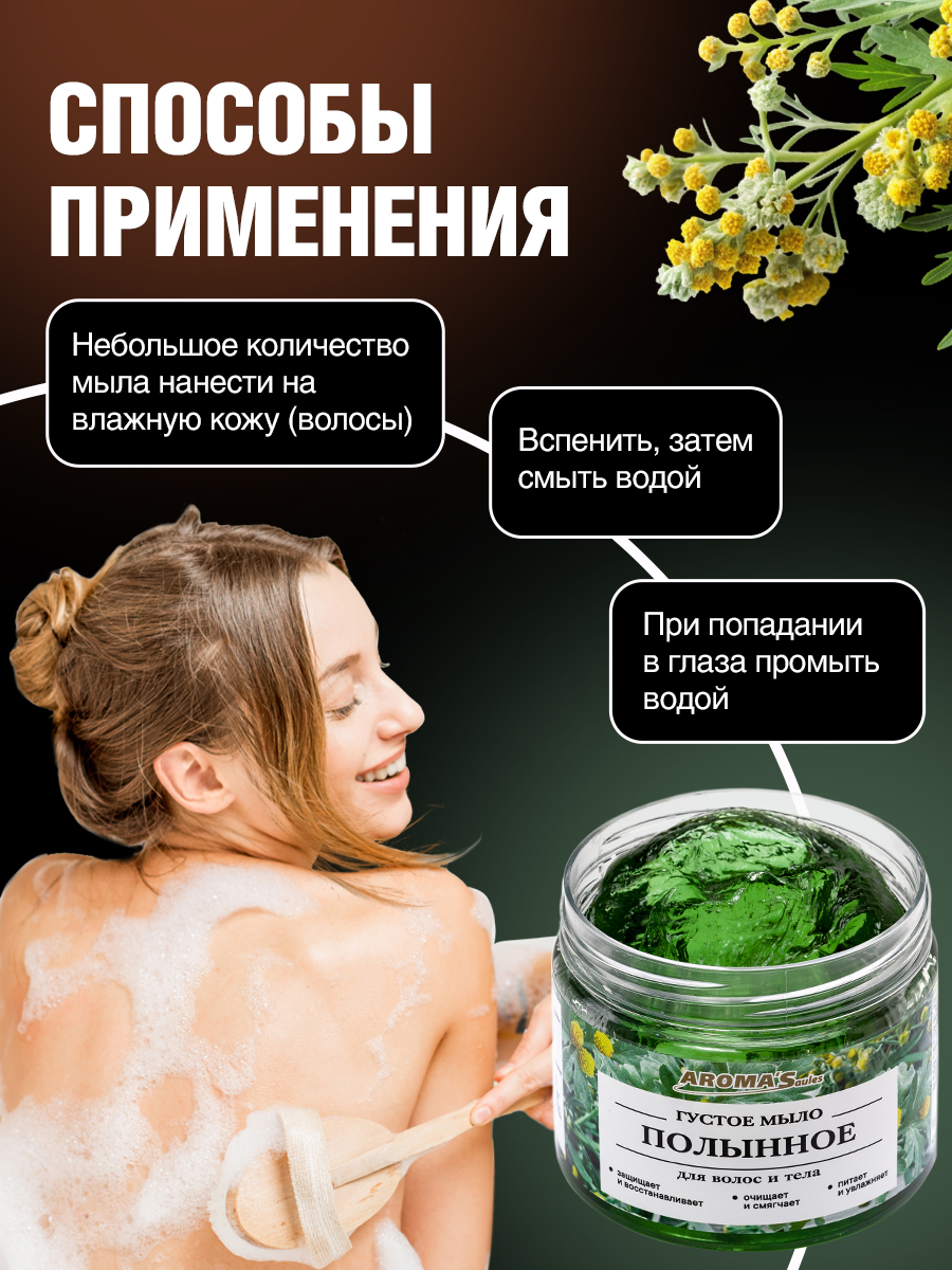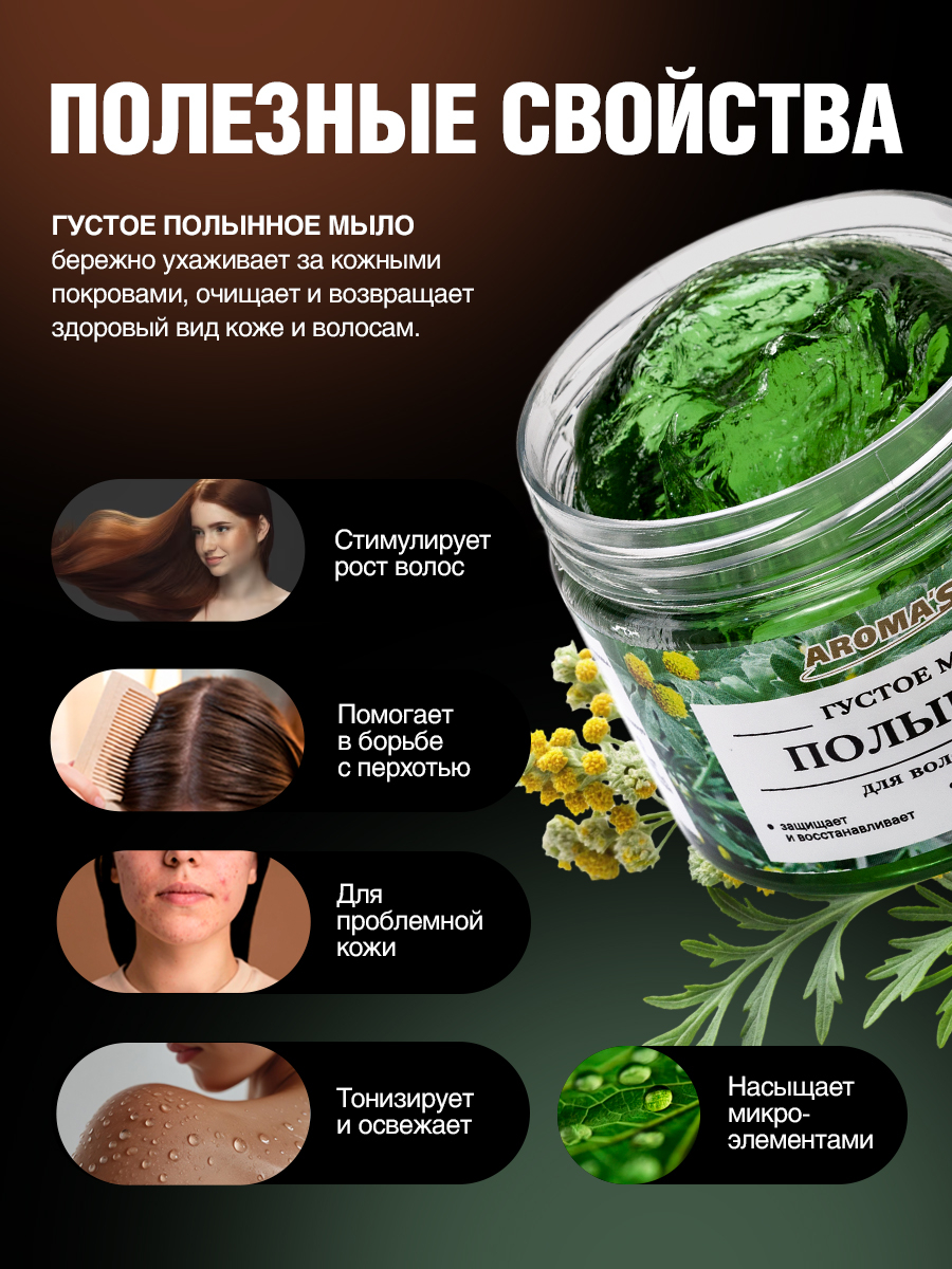 Благодаря богатому составу природных компонентов густое Полынное мыло бережно ухаживает за кожными покровами, очищает и возвращает здоровый вид коже и волосам.
