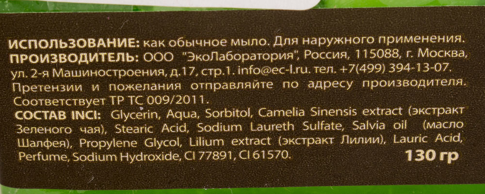 Glycerin, Aqua, Sorbitol, Camelia Sinensis extract (экстракт Зеленого чая), Stearic Acid, Sodium Laureth Sulfate, Salvia oil (масло Шалфея), Propylene Glycol, Lilium extract (экстракт Лилии), Lauric Acid, Perfume, Sodium Hydroxide, CI 77891, CI 61570.