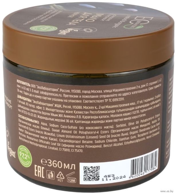 Aqua, sodium сoco-sulfate (из кокосового масла), cocamidopropyl betaine, sorbitol, olea europaea fruit oil (органическое масло оливы), prunus amygdalus dulcis oil (органическое масло миндаля), acrylates copolymer, linum usitatissimum seed oil (масло льна), theobroma cacao seed butter (органическое масло какао), sodium chloride, tocopheryl acetate (витамин е), rosmarinus officinalis leaf oil (эфирное масло розмарина), peg-7 glyceryl cocoate, peg-200 hydrogenated glyceryl palmate, sodium hydroxide, benzyl alcohol, ethylhexylglycerin, parfum, hexyl cinnamal, linalool, ci 18050, ci 19140, ci 42090.