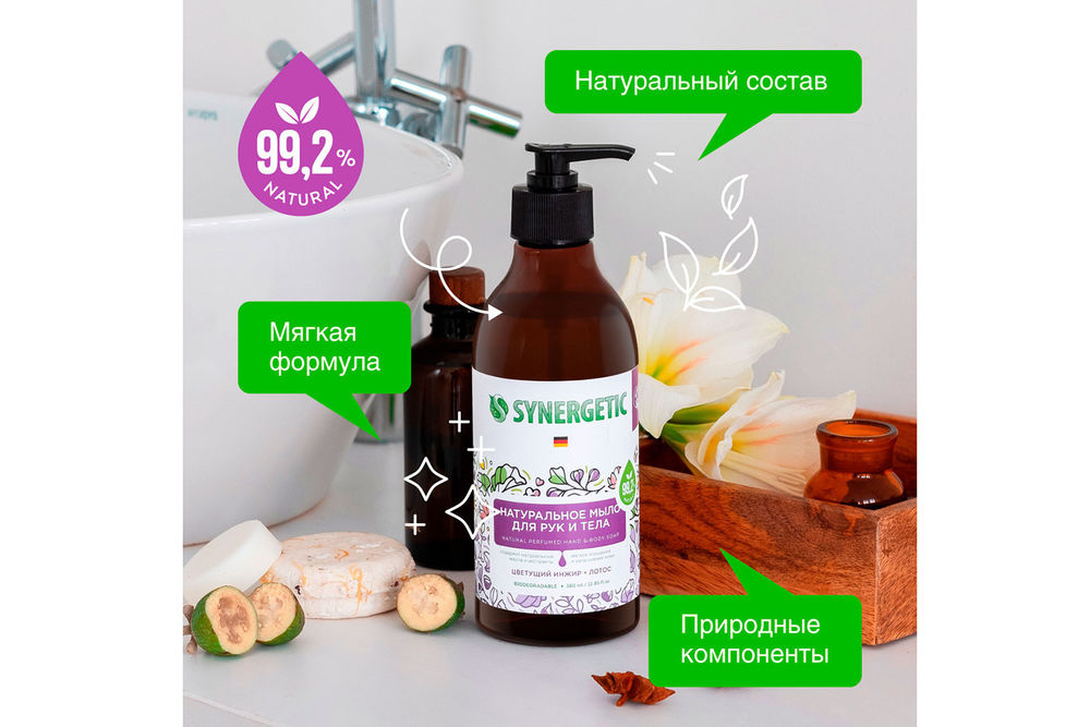 Натуральное биоразлагаемое мыло для рук и тела SYNERGETIC "Цветущий инжир и лотос" – это деликатное средство для очищения кожи, на 99,2% состоящее из натуральных компонентов. Гипоаллергенный аромат натурального мыла разработан в швейцарском доме Givaudan с использованием натуральных эфирных масел померанца, элеми, эвкалипта, лайма и мирта. Масла макадамии, гранатовых косточек и экстракты инжира и цветков лотоса оказывают регенерирующее действие, питают и увлажняют сухую кожу, делая её гладкой и бархатистой. Софоролипид из рапсового масла мягко очищает и сохраняет естественный микробиом кожи.