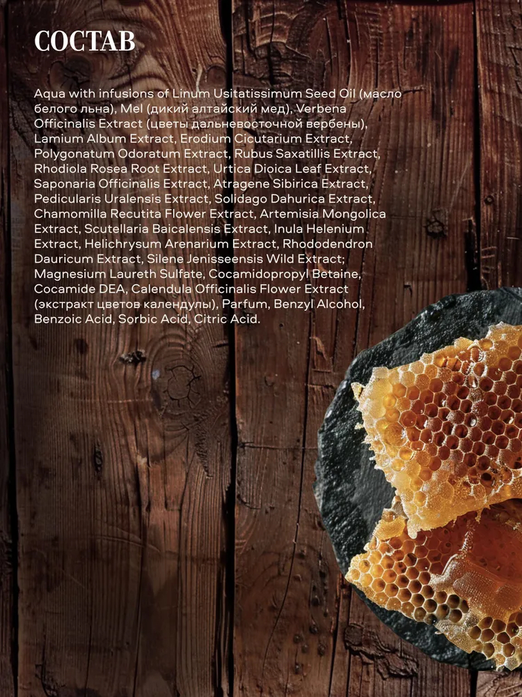 Aqua with infusions of Linum Usitatissimum Seed Oil (масло белого льна), Mel (дикий алтайский мед), Verbena Officinalis Extract (цветы дальневосточной вербены), Lamium Album Extract, Erodium Cicutarium Extract, Polygonatum Odoratum Extract, Rubus Saxatillis Extract, Rhodiola Rosea Root Extract, Urtica Dioica Leaf Extract, Saponaria Officinalis Extract, Atragene Sibirica Extract, Pedicularis Uralensis Extract, Solidago Dahurica Extract, Chamomilla Recutita Flower Extract, Artemisia Mongolica Extract, Scutellaria Baicalensis Extract, Inula Helenium Extract, Helichrysum Arenarium Extract, Rhododendron Dauricum Extract, Silene Jenisseensis Wild Extract, Magnesium Laureth Sulfate, Cocamidopropyl Betaine, Cocamide DEA, Calendula Officinalis Flower Extract (экстракт цветов календулы), Parfum, Benzyl Alcohol, Benzoic Acid, Sorbic Acid, Citric Acid.Мы используем файлы cookie для обеспечения удобства работы с сайтом и его контакта с пользователем.