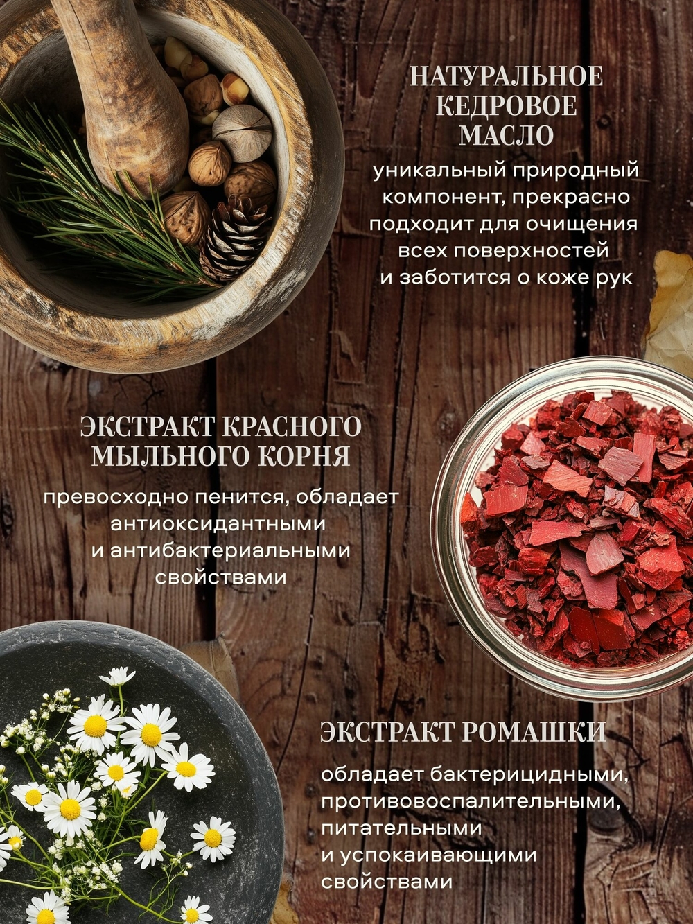 Мыло содержит натуральное кедровое масло, уникальный по своему действию природный компонент, благодаря чему прекрасно подходит не только для всех видов хозяйственных работ, но и благотворно влияет на кожу.