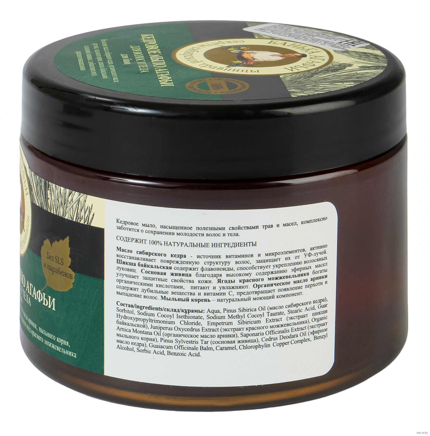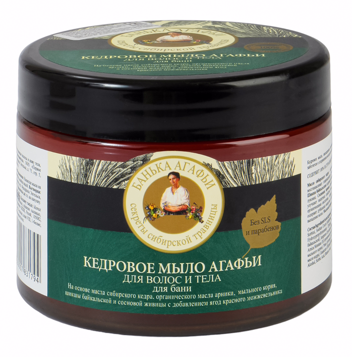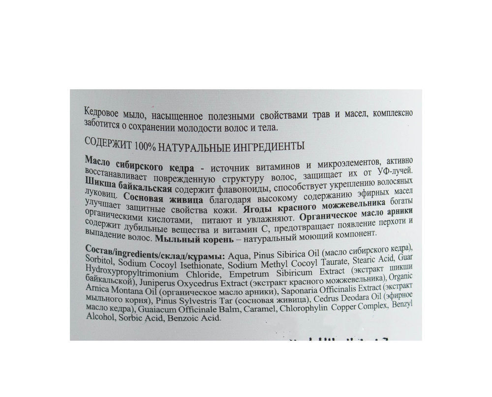 Aqua, Pinus Sibirica Oil (масло сибирского кедра), Sorbitol, Sodium Cocoyl Isethionate, Sodium Methyl Cocoyl Taurate, Stearic Acid, Guar Hydroxypropyltrimonium Chloride, Empetrum Sibiricum Extract (экстракт шикши байкальской), Juniperus Oxycedrus Extract (экстракт красного можжевельника), Organic Arnica Montana Oil (органическое масло арники), Saponaria Officinalis Extract (экстракт мыльного корня), Pinus Sylvestris Tar (сосновая живица), Cedrus Deodara Oil (эфирное масло кедра), Guaiacum Officinale Balm, Caramel, Chlorophylin Copper Complex, Benzyl Alcohol, Sorbic Acid, Benzoic Acid.