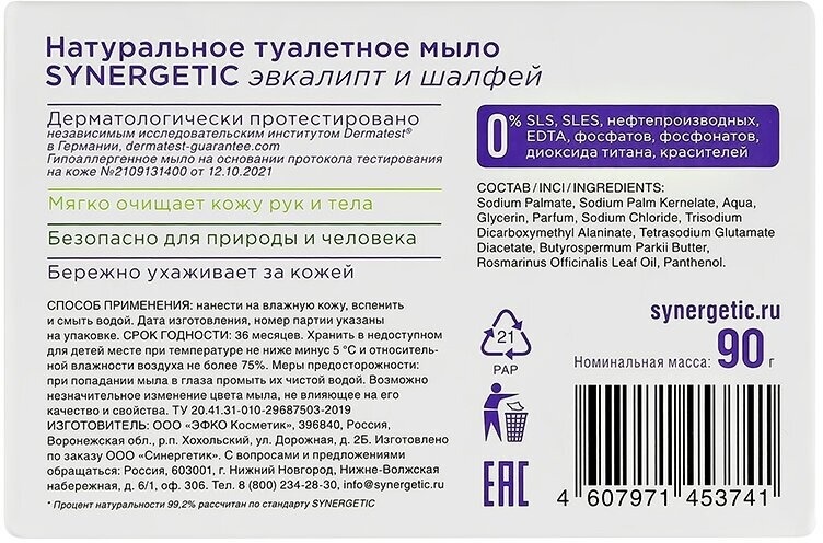 Натуральное туалетное мыло "Эвкалипт и шалфей" для рук и тела мягко очищает, дарит коже приятный аромат хвои с насыщенными травянистыми нотками.