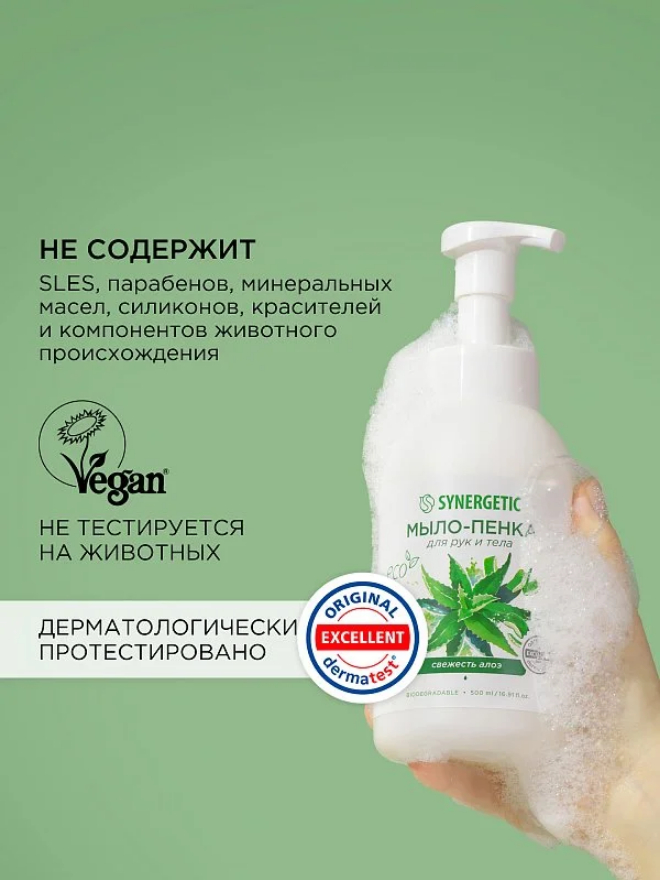 Нежная воздушная пенка не сушит кожу, подходит для людей с чувствительной кожей и детей с первых дней жизни. Мыло дерматологически протестировано независимым исследовательским институтом Dermatest в Германии.