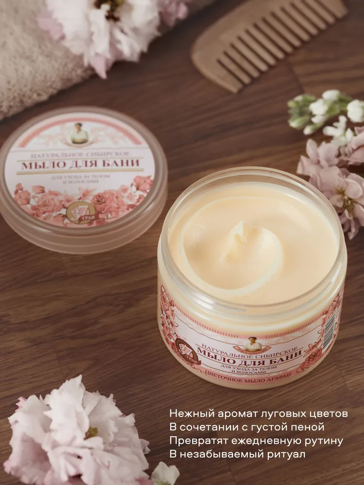 В состав цветочного мыла кроме множества ценных сибирских трав входят цветочные нектары, пыльца и воск, что делает данный продукт нежным, легким и ароматным.