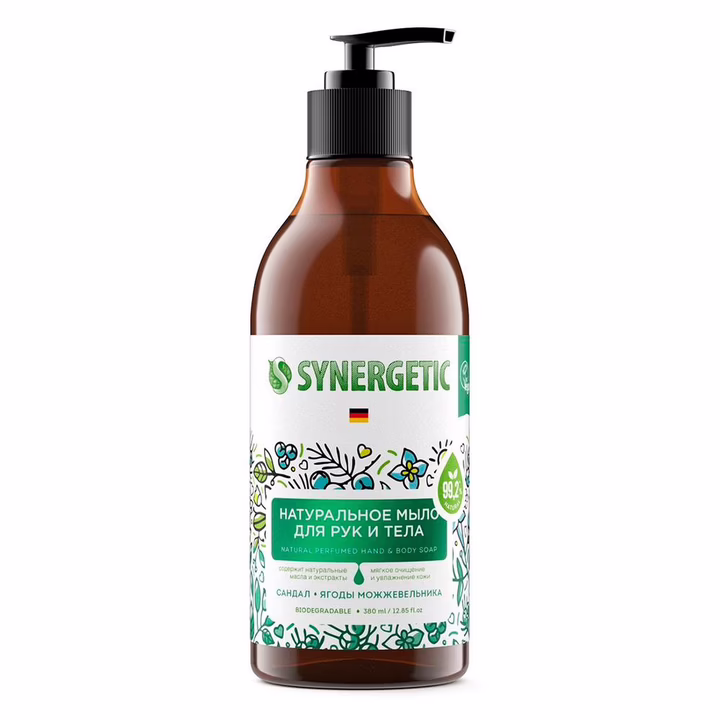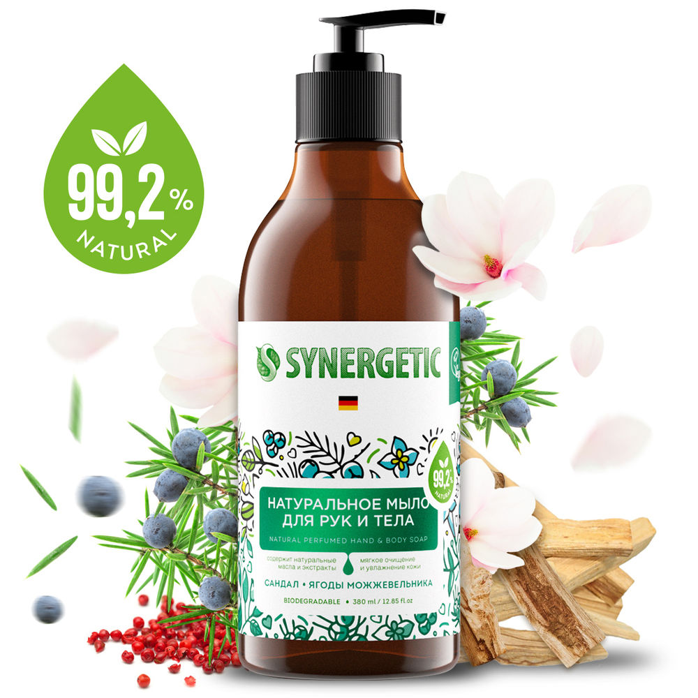 Натуральное биоразлагаемое мыло для рук и тела SYNERGETIC "Сандал и ягоды можжевельника" – это деликатное средство для очищения кожи, на 99,2% состоящее из натуральных компонентов.