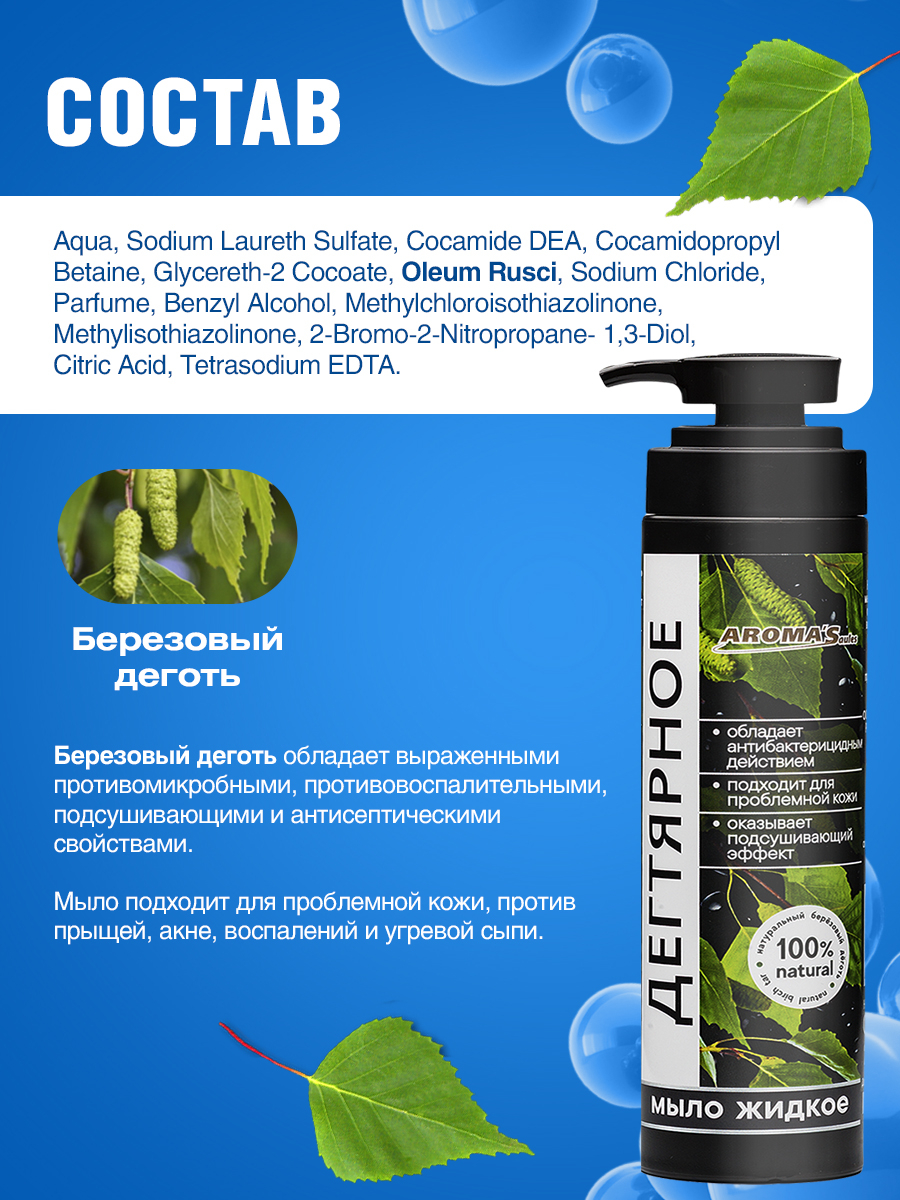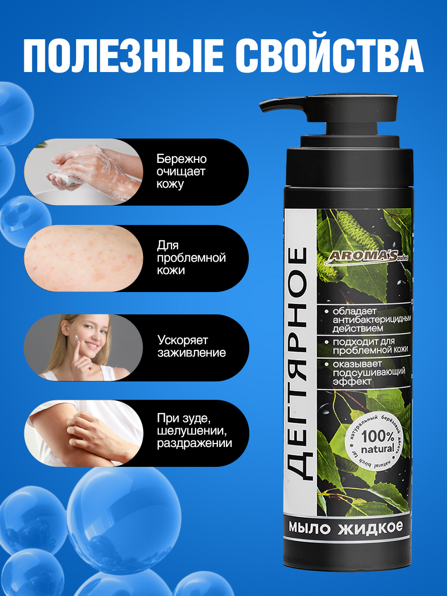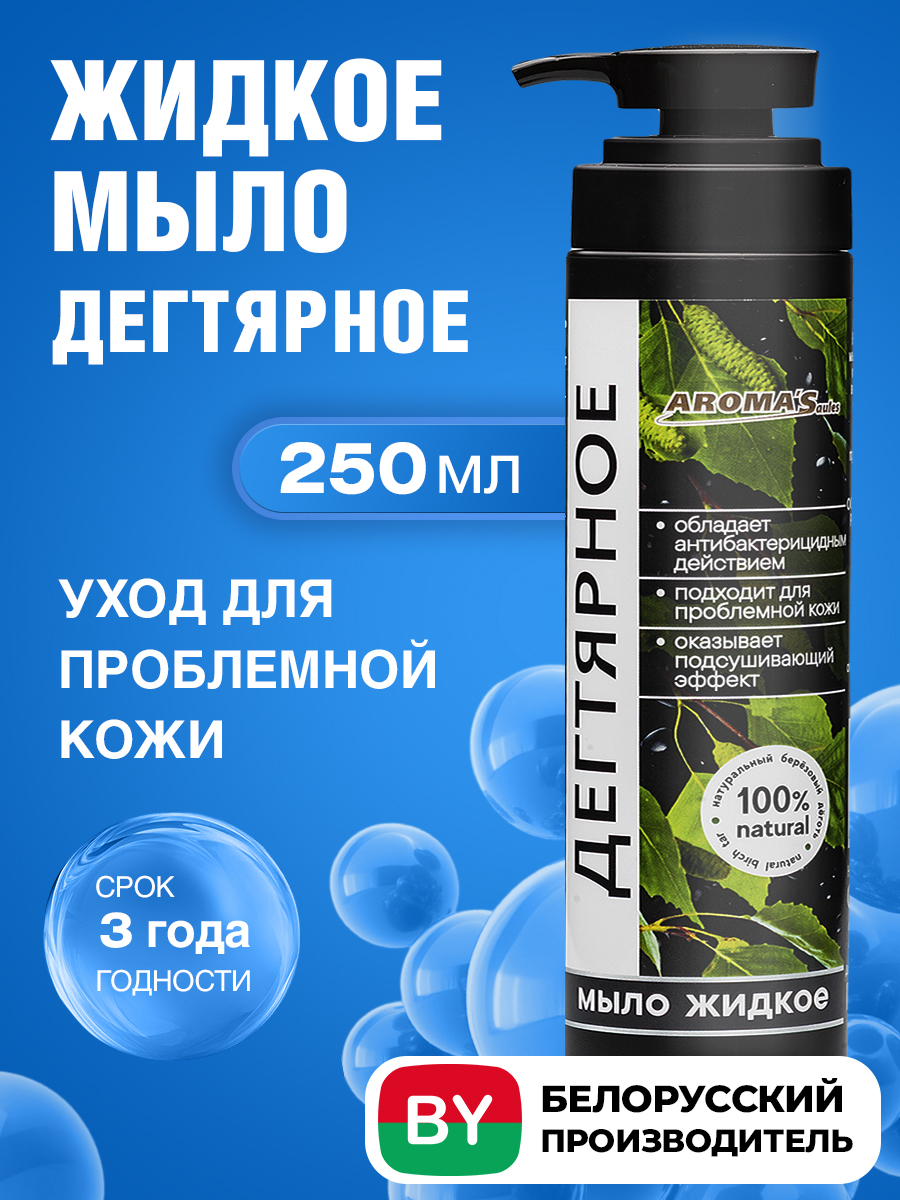 Жидкое мыло "Дегтярное" на основе натурального берёзового дёгтя подходит для проблемной кожи, оказывает подсушивающий эффект, обладает антибактерицидным действием.