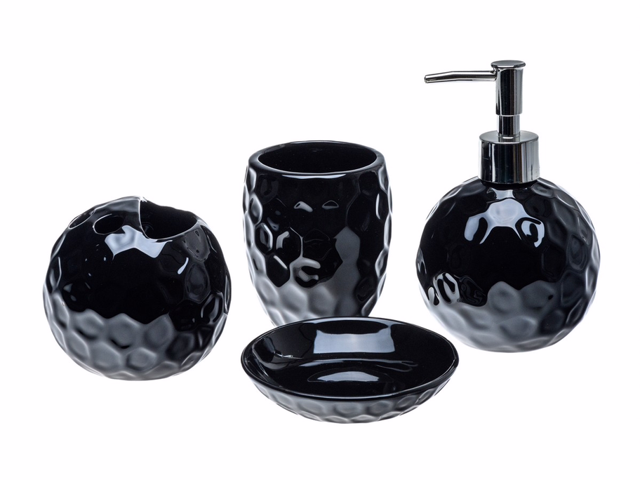 В наборе дозатор для мыла 9,5х15 см, мыльница 13,5х10,5 см, подставка для зубных щёток 12,5х7,5х8,5 см, стакан.