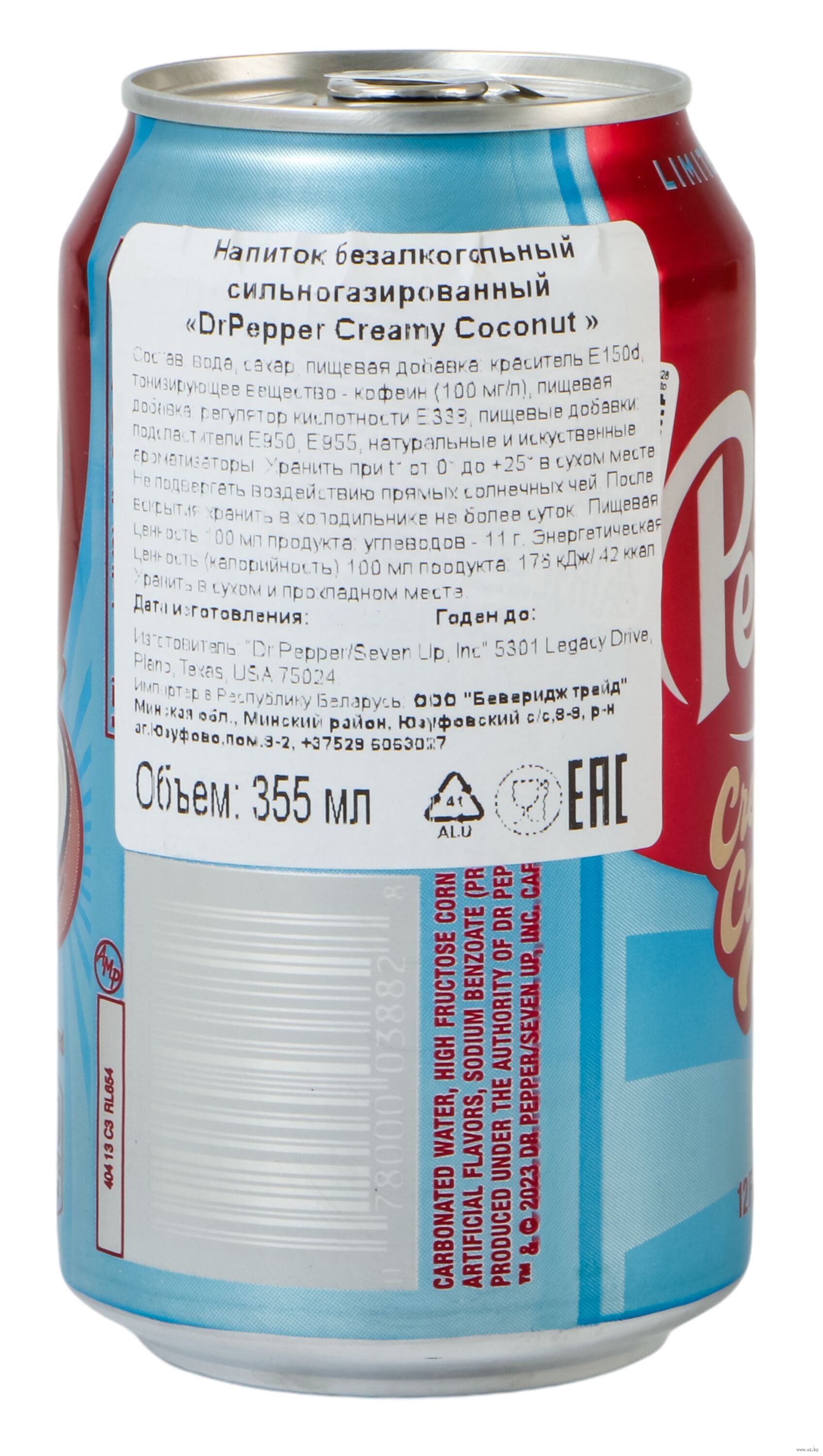 Только в течение ограниченного времени побалуйте себя лучшим лакомством лета 2024 года – "Creamy Coconut". Начали с уникальной смеси из 23 вкусов и объединили этот отличительный вкус Dr. Pepper с освежающим вкусом кокоса, который перенесет вас в летний рай.