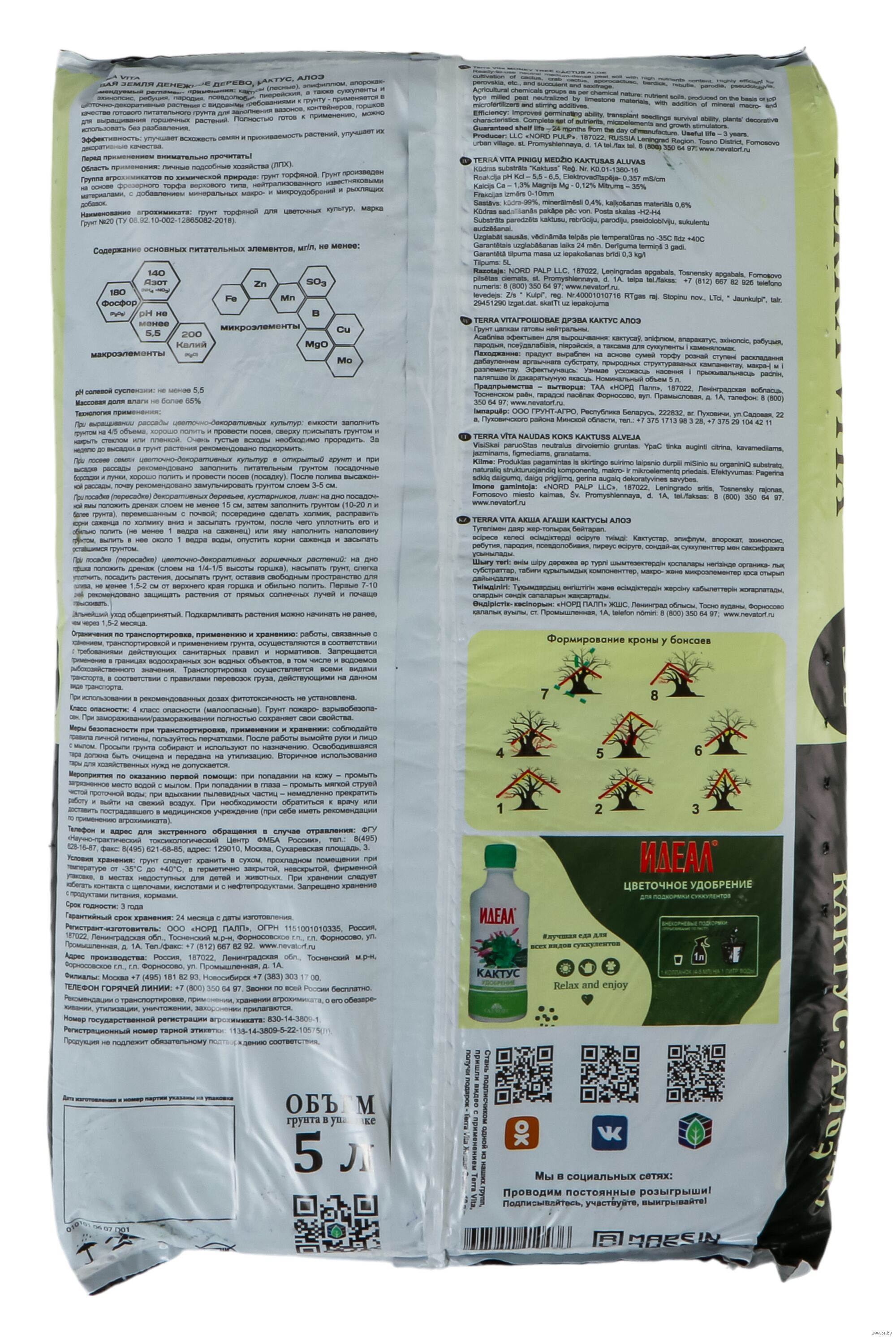 Полностью готовый торфяной питательный грунт предназначенный для выращивания толостянки, кактуса, алоэ, зигокактуса усеченного, эпифиллюма, апорокактуса, эхинопсиса, ребуции, пародии, псевдолобивии, пиерейскии, суккулентов. Грунт эффективен для всех видов садовых растений. Произведен на основе фрезерного торфа верхового типа нейтрализованного известняковыми материалами. Питательный грунт улучшает всхожесть семян и приживаемость растений, а так же декоративные свойства цветов. ph солевой суспензии не менее 5.5, массовая доля влаги не более 65%. Основные питательный элеенты – 140 – азот, 200 – калий, 180 – фосфор.