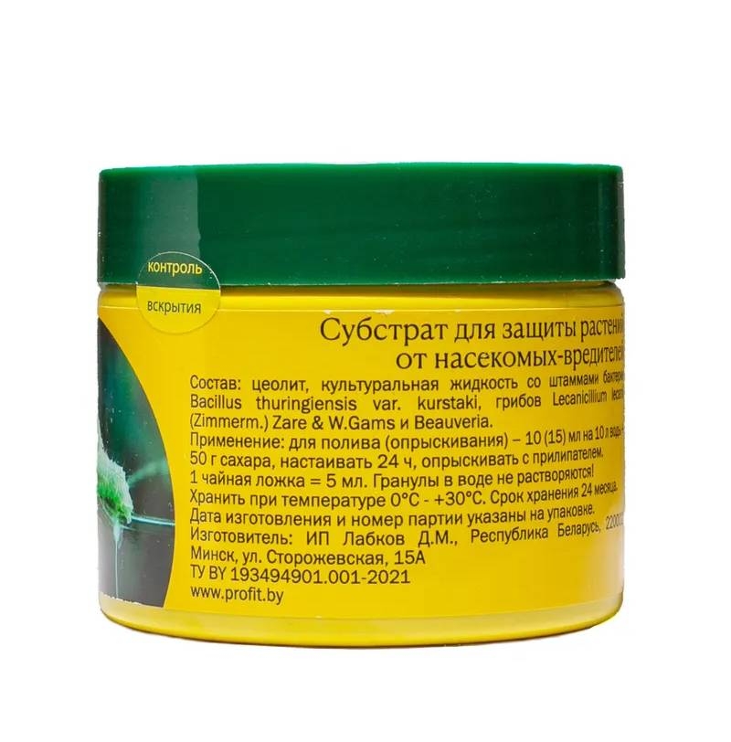 Состав: композиция бактерии рода Bacillus thuringiensis var. kurstaki, а также двух штаммов грибов рода Lecanicillium lecanii (Zimmerm.) Zare & W.Gams и рода Beauveria bassiana на цеолите.