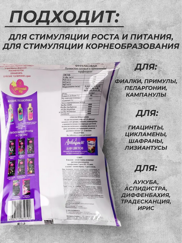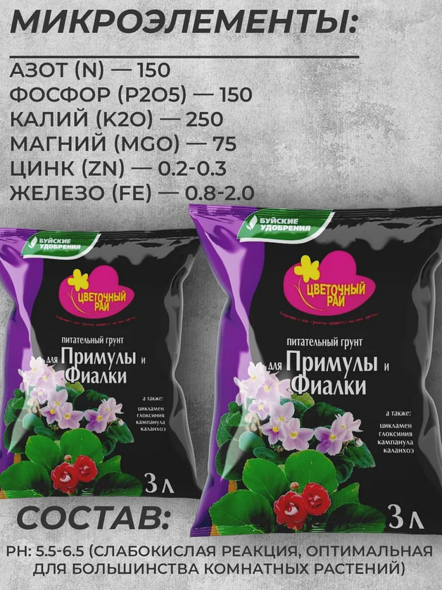 Грунт "Цветочный рай" для примул и фиалок – это универсальный и готовый к применению субстрат для выращивания комнатных цветов, таких как фиалки, примулы, цикламены, глоксинии, каланхоэ и кампаниюлы. Этот специализированный грунт обеспечивает быстрое приживание, активное развитие, яркое и длительное цветение, а также устойчивость к болезням и вредителям. Оптимальный питательный состав способствует формированию красивых декоративных цветов и здоровой корневой системы.