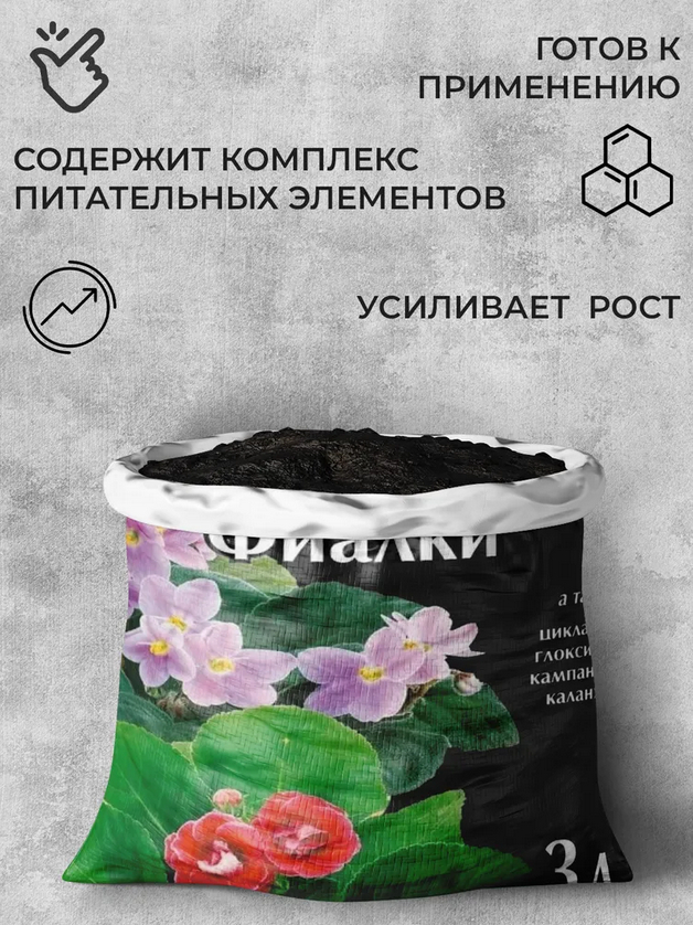Преимущества включают полностью готовую к использованию структуру, насыщенность комплексом питательных веществ и улучшенную адаптацию растений после пересадки. Грунт способствует длительному цветению, яркому внешнему виду и аккуратной декоративности почвы. Благодаря сбалансированному составу он отлично подходит для выращивания и пересадки фиалок, примул, глоксиний, каланхоэ, кампаниюлов и других декоративных комнатных и садовых растений.