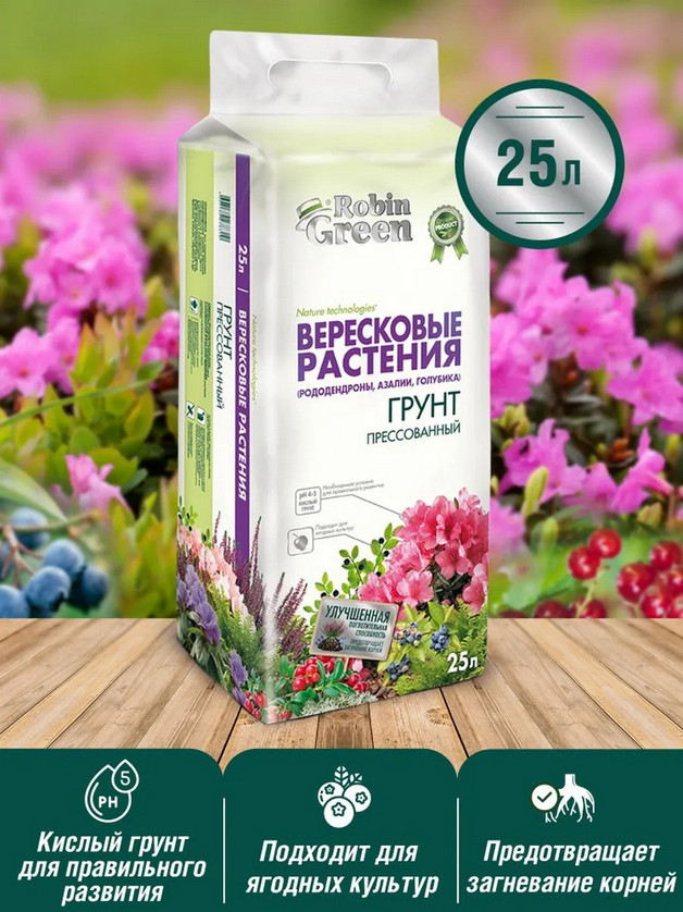Земля для вересковых растений "Робин Грин" – полностью готовая к применению смесь, специально разработанная для выращивания и пересадки всех видов вересковых декоративных растений (рододендронов, азалий, папоротников), а также ягодных культур, таких как брусника, голубика и клюква.
