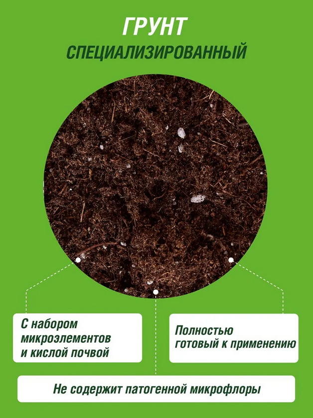 Состав: торф верховой, агроперлит, дренаж, известняковая мука, комплексное минеральное удобрение, комплексное минеральное удобрение с микроэлементами.