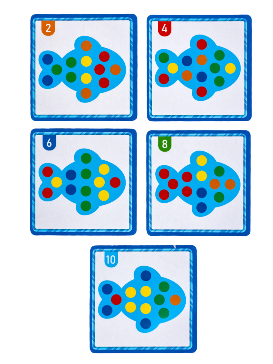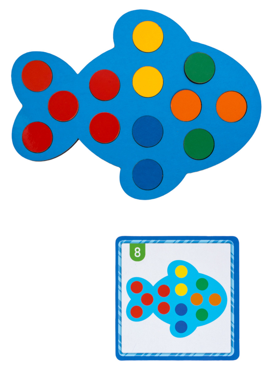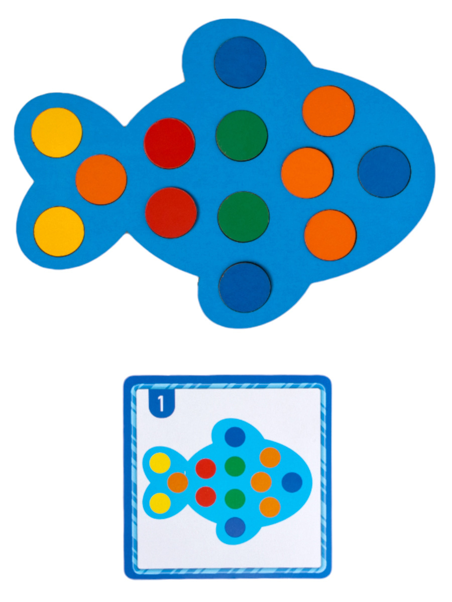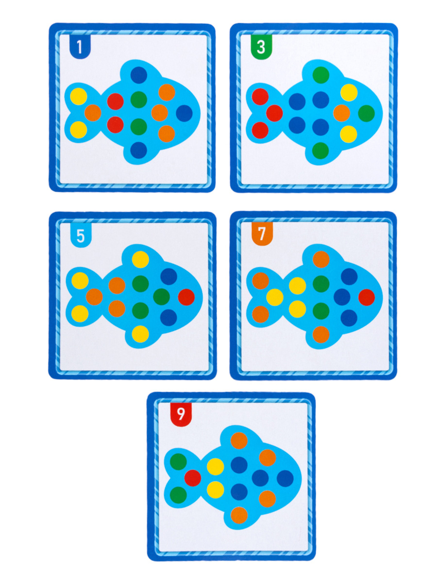 В составе развивающей игры для детей "Рыбка" есть карточки с заданиями.