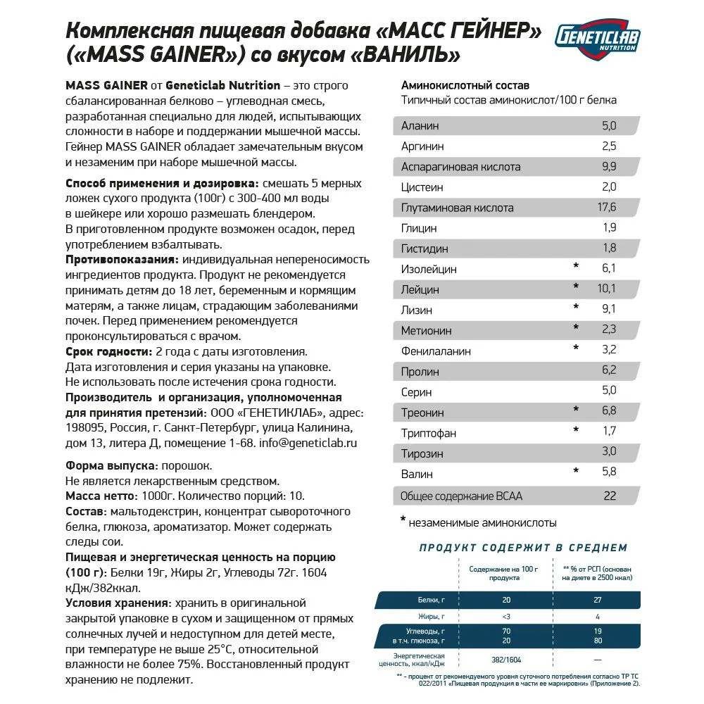 | Изготовитель | ООО «ГЕНЕТИКЛАБ НУТРИШН». Россия, г.Санкт-Петербург, Серебристый б-р, д.21, лит.А, помещение 64Н |
