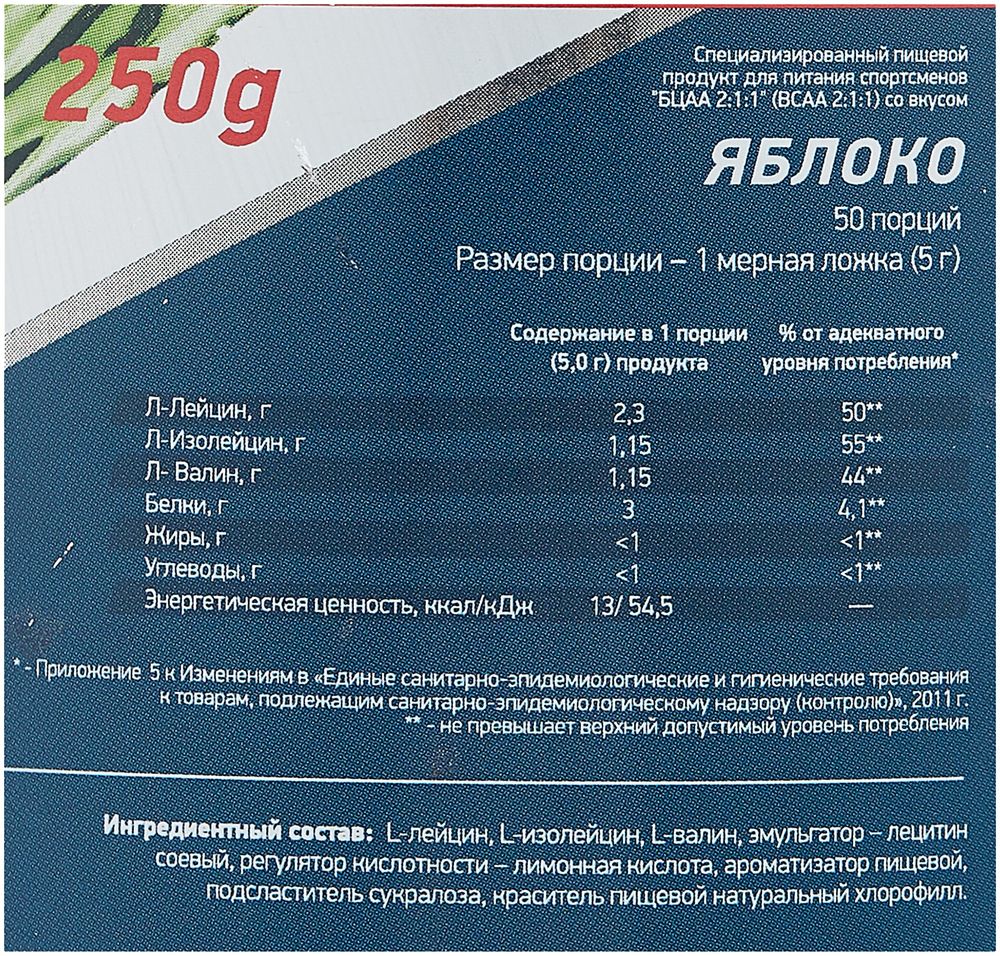 L-лейцин, L-изолейцин, L-валин, эмульгатор - лецитин (соевый), ароматизатор пищевой, регулятор кислотности - лимонная кислота, подсластитель сукралоза, краситель пищевой натуральный хлорофилл.Способ приготовления