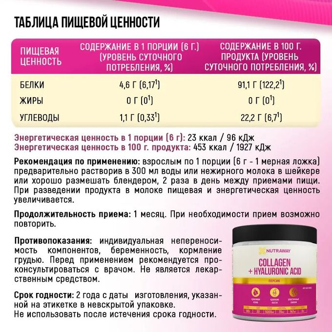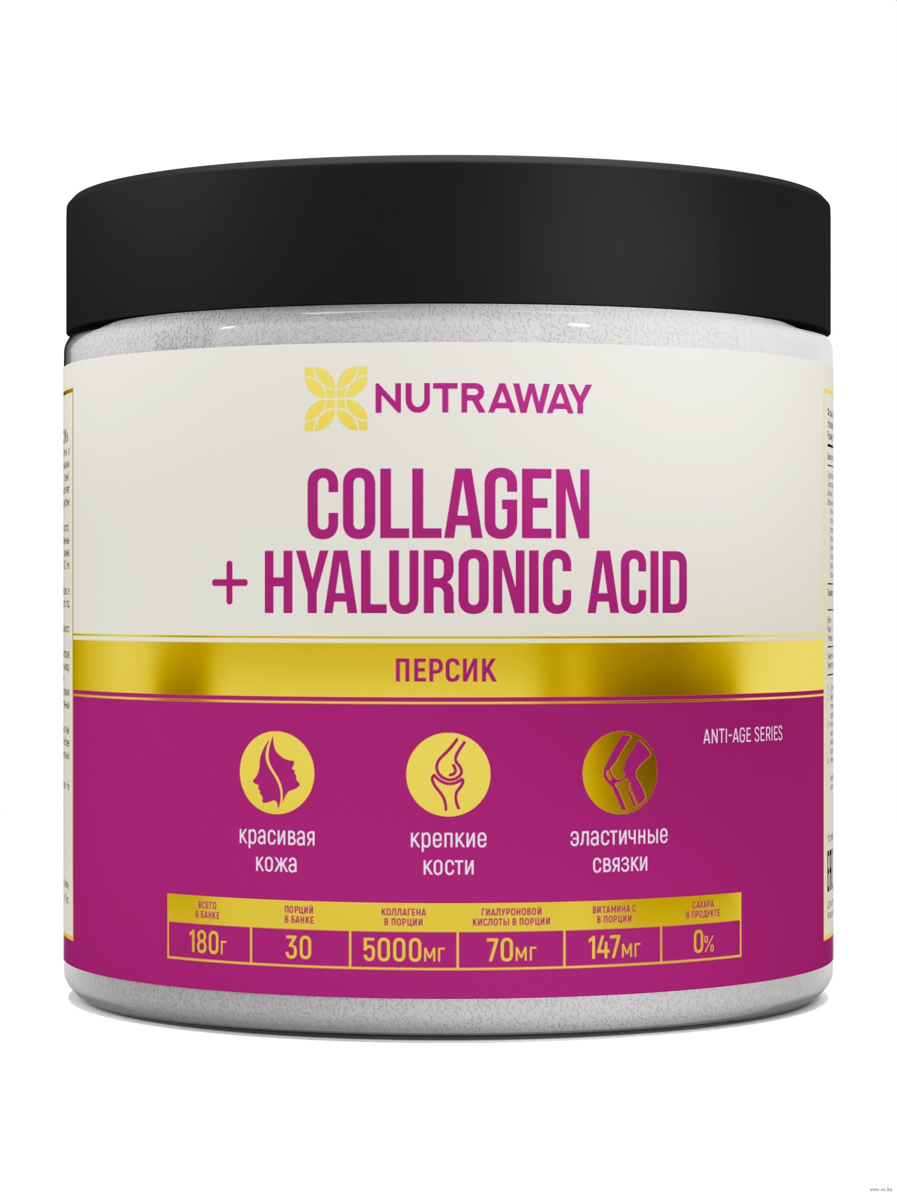 Ежедневный прием COLLAGEN + hyaluronic acid от NUTRAWAYТМ стимулирует выработку собственного коллагена в организме, способствуя омоложению изнутри. Гидролизованный коллаген является основным структурным белком, который содержится во всем организме и обеспечивает важную инфраструктуру как внутри, так и снаружи. Во-первых, это основной компонент нашей кожи, делает ее более эластичной и упругой. Когда коллагена в коже достаточно, первые морщины появляются позже, а старение кожи замедляется. Во-вторых, формирует структуру хрящевой ткани, поддерживают нормальную амортизацию суставов, помогает укрепить сухожилия и связки. Гиалуроновая кислота дополняет омолаживающий эффект кожи. Отвечает за ее увлажнение и тем самым заботится о том, чтобы кожа дольше сохраняла свою упругость и эластичность. Хорошо увлажненная кожа – здоровая кожа. Витамин С усиливает действие коллагена, участвует в его синтезе и является антиоксидантом.