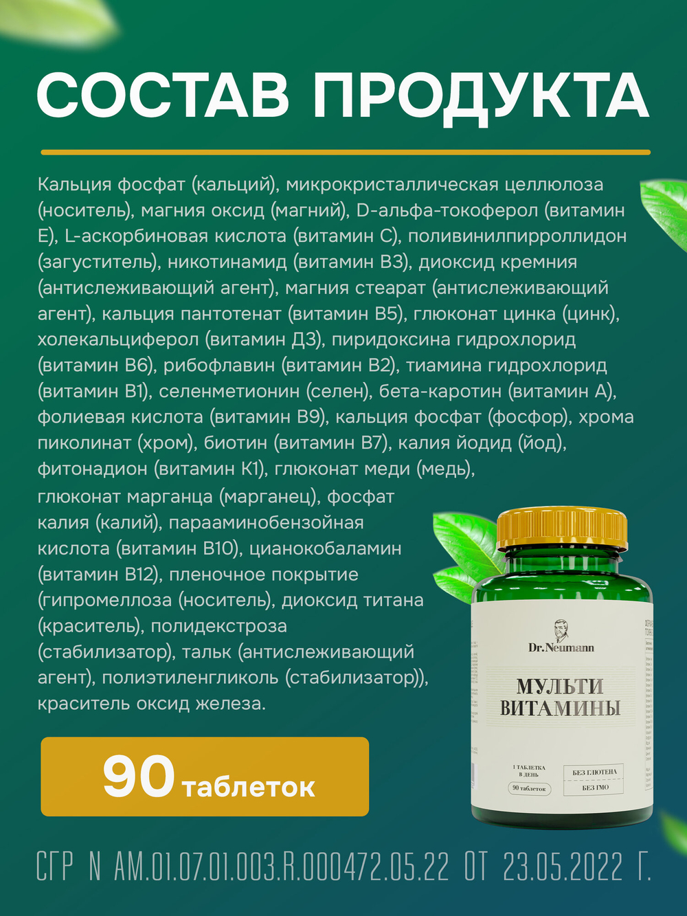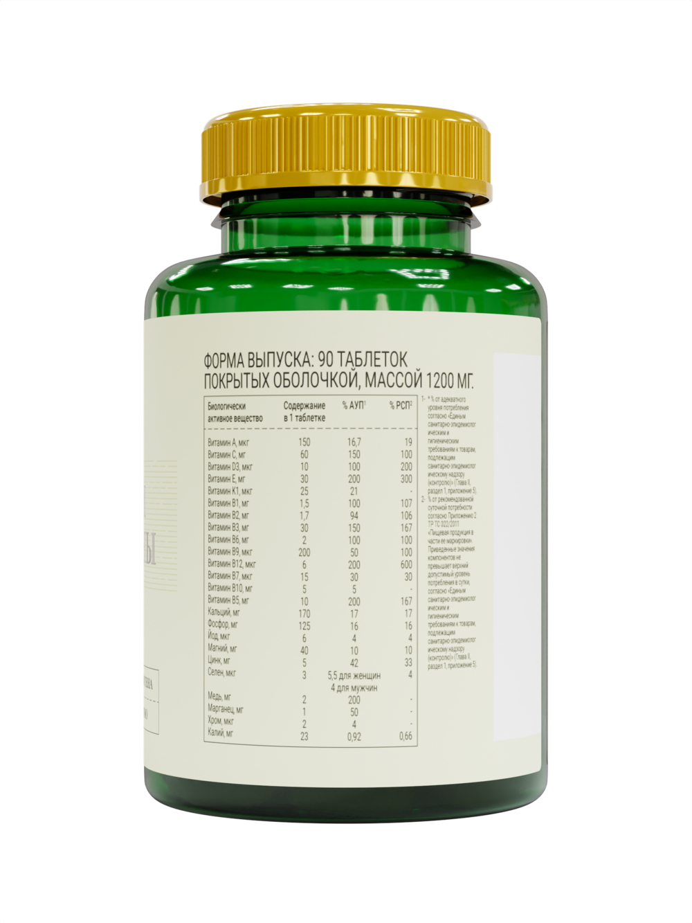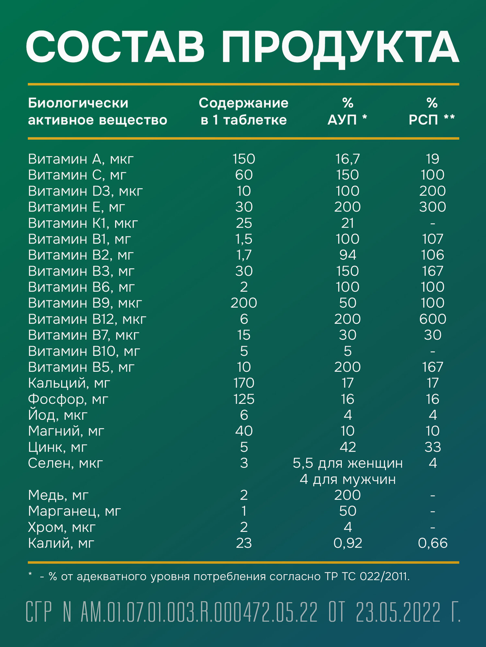Кальция фосфат (кальций), микрокристаллическая целлюлоза (носитель), магния оксид (магний), D-альфа-токоферол (витамин Е), L-аскорбиновая кислота (витамин С), поливинилпирроллидон (загуститель), никотинамид (витамин В3), диоксид кремния (антислеживающий агент), магния стеарат (антислеживающий агент), кальция пантотенат (витамин В5), глюконат цинка (цинк), холекальциферол (витамин Д3), пиридоксина гидрохлорид (витамин В6), рибофлавин (витамин В2), тиамина гидрохлорид (витамин В1), селенметионин (селен), бета-каротин (витамин А), фолиевая кислота (витамин В9), кальция фосфат (фосфор), хрома пиколинат (хром), биотин (витамин В7), калия йодид (йод), фитонадион (витамин К1), глюконат меди (медь), глюконат марганца (марганец), фосфат калия (калий), парааминобензойная кислота (витамин В10), цианокобаламин (витамин В12), пленочное покрытие (гипромеллоза (носитель), диоксид титана (краситель), полидекстроза (стабилизатор), тальк (антислеживающий агент), полиэтиленгликоль (стабилизатор)), краситель оксид железа.Способ приготовления